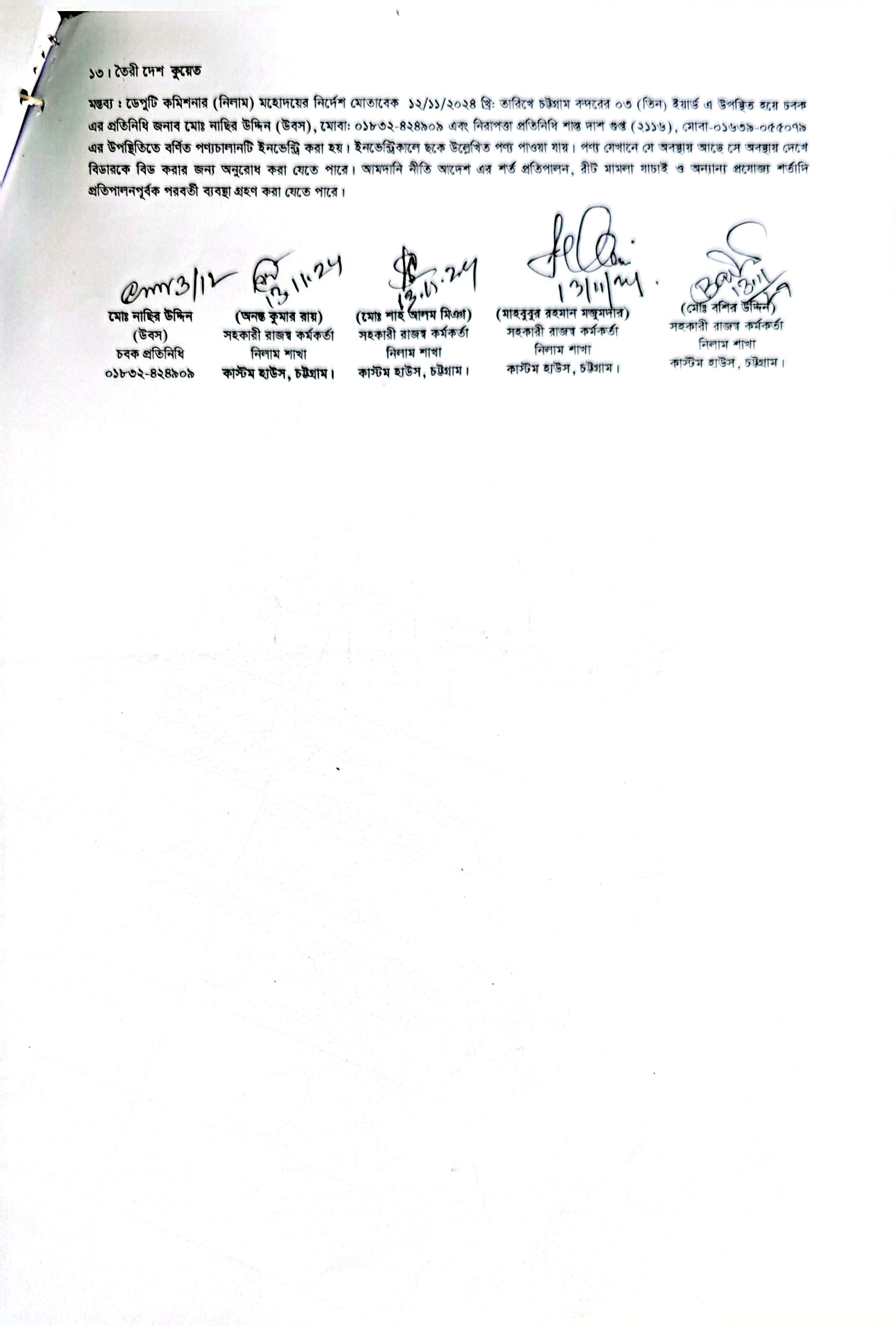 Terms & condition : আমদানি নীতি আদেশ এবং বিদ্যমান অন্যান্য আইন ও বিধি-বিধানের প্রযোজ্য সকল শর্ত পরিপালন এবং প্রযোজ্য ক্ষেত্রে রাসায়নিক পরীক্ষায় পণ্যের সঠিকতা ও ব্যবহার উপযোগিতা থাকা সাপেক্ষে খালাসকালে পণ্যের বর্ণনা এবং ওজন নিশ্চিত করে পণ্য ছাড়যোগ্য হবে। কোন লটভুক্ত পণ্যচালানে মেয়াদ উত্তীর্ণ/ধ্বসংযোগ্য পণ্য অন্তর্ভুক্ত থাকলে, উক্ত পণ্যচালানের ক্ষেত্রে মেয়াদ উত্তীর্ণ/ধ্বসংযোগ্য পণ্য ব্যতীত (প্রযোজ্য ক্ষেত্রে) কেবল মেয়াদযুক্ত/নিলামযোগ্য পণ্যসমূহ বিদ্যমান ও প্রযোজ্য আইন ও বিধি-বিধানের প্রযোজ্য সকল শর্ত পরিপালন সাপেক্ষে পণ্য ছাড়যোগ্য হবে। সার্ভার জটিলতা এড়ানোর জন্য আগ্রহী নিলাম ক্রেতাগণকে সরেজমিন পণ্য দেখে নিলামের নির্ধারিত শেষ তারিখ ও সময়ের (২৪/১২/২০২৫ খ্রি. তারিখ দুপুর ০২.০০ টা) পূর্বেই বিশেষ ই-নিলামে অংশগ্রহণ করার জন্য অনুরোধ করা যাচ্ছে। কোনরূপ কারণ দর্শানো ব্যতিরেকে কর্তৃপক্ষ যে কোন সময় ও পর্যায়ে যে কোন লট বা সকল লটের নিলাম আংশিক বা সম্পূর্ণ স্থগিত বা বাতিলের অধিকার সংরক্ষণ করেন।