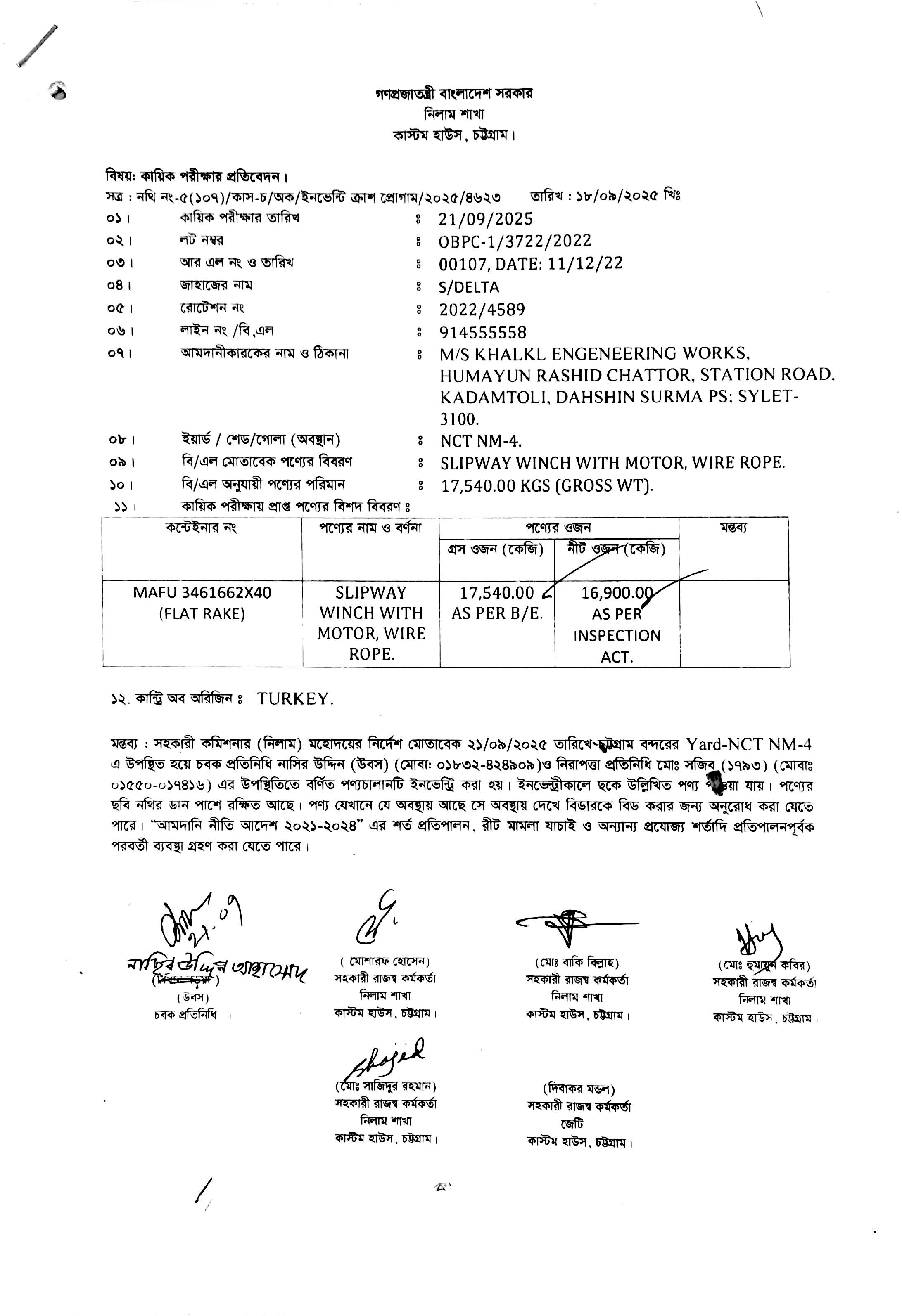 Terms & condition : আমদানি নীতি আদেশ এবং বিদ্যমান অন্যান্য আইন ও বিধি-বিধানের প্রযোজ্য সকল শর্ত পরিপালন এবং প্রযোজ্য ক্ষেত্রে রাসায়নিক পরীক্ষায় পণ্যের সঠিকতা ও ব্যবহার উপযোগিতা থাকা সাপেক্ষে খালাসকালে পণ্যের বর্ণনা এবং ওজন নিশ্চিত করে পণ্য ছাড়যোগ্য হবে। কোন লটভুক্ত পণ্যচালানে মেয়াদ উত্তীর্ণ/ধ্বসংযোগ্য পণ্য অন্তর্ভুক্ত থাকলে, উক্ত পণ্যচালানের ক্ষেত্রে মেয়াদ উত্তীর্ণ/ধ্বসংযোগ্য পণ্য ব্যতীত (প্রযোজ্য ক্ষেত্রে) কেবল মেয়াদযুক্ত/নিলামযোগ্য পণ্যসমূহ বিদ্যমান ও প্রযোজ্য আইন ও বিধি-বিধানের প্রযোজ্য সকল শর্ত পরিপালন সাপেক্ষে পণ্য ছাড়যোগ্য হবে। সার্ভার জটিলতা এড়ানোর জন্য আগ্রহী নিলাম ক্রেতাগণকে সরেজমিন পণ্য দেখে নিলামের নির্ধারিত শেষ তারিখ ও সময়ের (২৪/১২/২০২৫ খ্রি. তারিখ দুপুর ০২.০০ টা) পূর্বেই বিশেষ ই-নিলামে অংশগ্রহণ করার জন্য অনুরোধ করা যাচ্ছে। কোনরূপ কারণ দর্শানো ব্যতিরেকে কর্তৃপক্ষ যে কোন সময় ও পর্যায়ে যে কোন লট বা সকল লটের নিলাম আংশিক বা সম্পূর্ণ স্থগিত বা বাতিলের অধিকার সংরক্ষণ করেন।