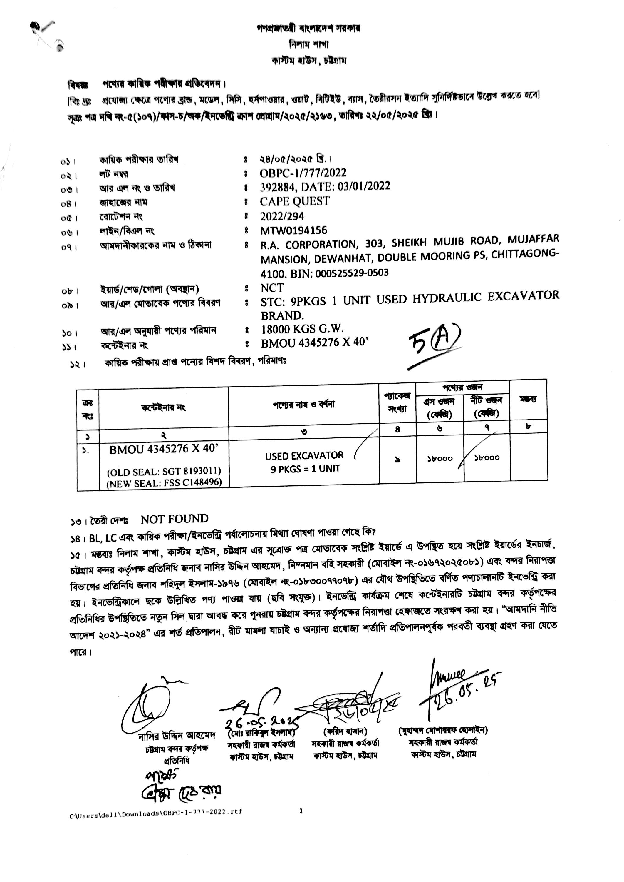 Terms & condition : আমদানি নীতি আদেশ এবং বিদ্যমান অন্যান্য আইন ও বিধি-বিধানের প্রযোজ্য সকল শর্ত পরিপালন এবং প্রযোজ্য ক্ষেত্রে রাসায়নিক পরীক্ষায় পণ্যের সঠিকতা ও ব্যবহার উপযোগিতা থাকা সাপেক্ষে খালাসকালে পণ্যের বর্ণনা এবং ওজন নিশ্চিত করে পণ্য ছাড়যোগ্য হবে। কোন লটভুক্ত পণ্যচালানে মেয়াদ উত্তীর্ণ/ধ্বসংযোগ্য পণ্য অন্তর্ভুক্ত থাকলে, উক্ত পণ্যচালানের ক্ষেত্রে মেয়াদ উত্তীর্ণ/ধ্বসংযোগ্য পণ্য ব্যতীত (প্রযোজ্য ক্ষেত্রে) কেবল মেয়াদযুক্ত/নিলামযোগ্য পণ্যসমূহ বিদ্যমান ও প্রযোজ্য আইন ও বিধি-বিধানের প্রযোজ্য সকল শর্ত পরিপালন সাপেক্ষে পণ্য ছাড়যোগ্য হবে। সার্ভার জটিলতা এড়ানোর জন্য আগ্রহী নিলাম ক্রেতাগণকে সরেজমিন পণ্য দেখে নিলামের নির্ধারিত শেষ তারিখ ও সময়ের (২৪/১২/২০২৫ খ্রি. তারিখ দুপুর ০২.০০ টা) পূর্বেই বিশেষ ই-নিলামে অংশগ্রহণ করার জন্য অনুরোধ করা যাচ্ছে। কোনরূপ কারণ দর্শানো ব্যতিরেকে কর্তৃপক্ষ যে কোন সময় ও পর্যায়ে যে কোন লট বা সকল লটের নিলাম আংশিক বা সম্পূর্ণ স্থগিত বা বাতিলের অধিকার সংরক্ষণ করেন।