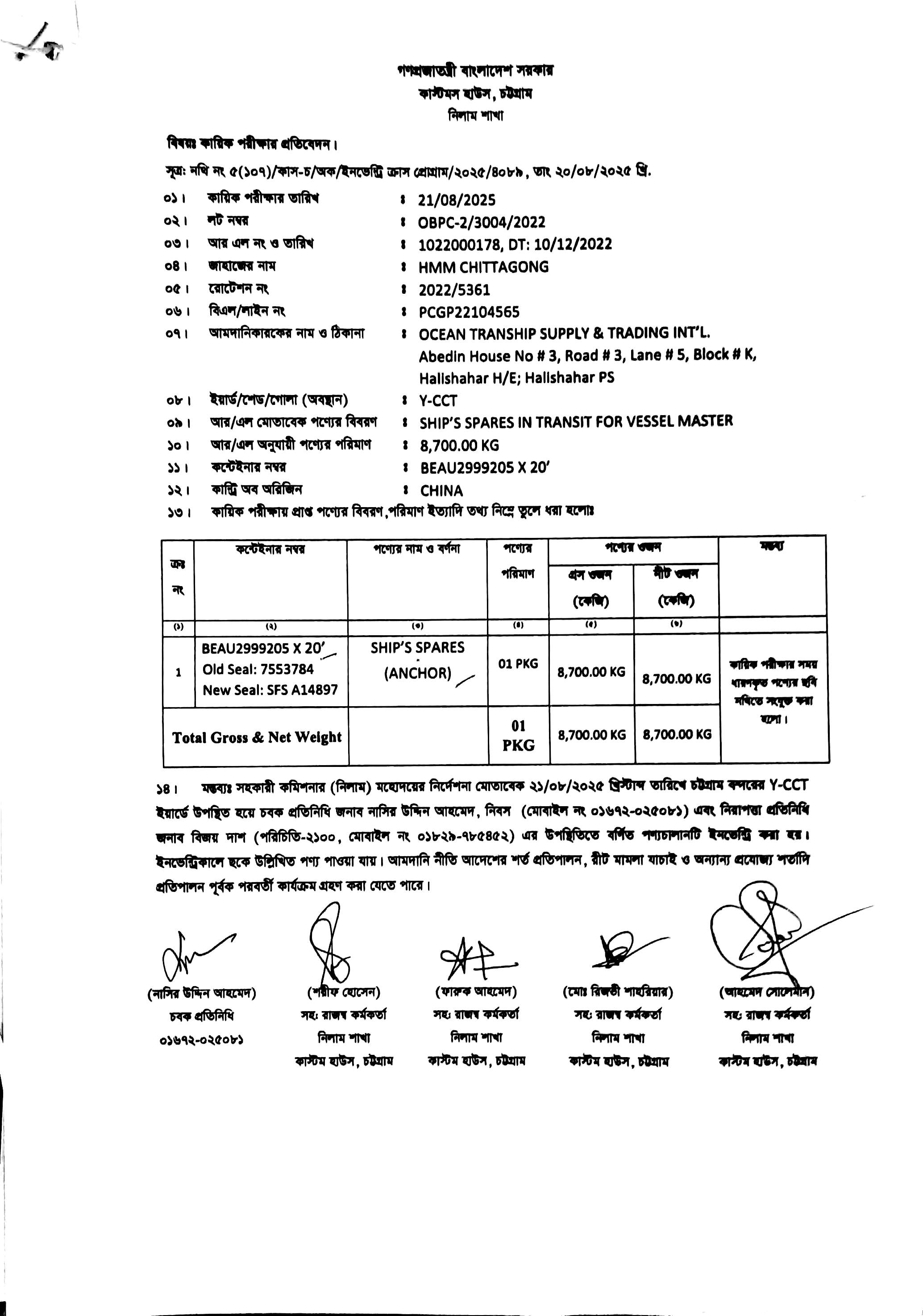 লটের শিরোনাম :Ship’s Spares (Anchor)(Previous Bid: 0 TK)
