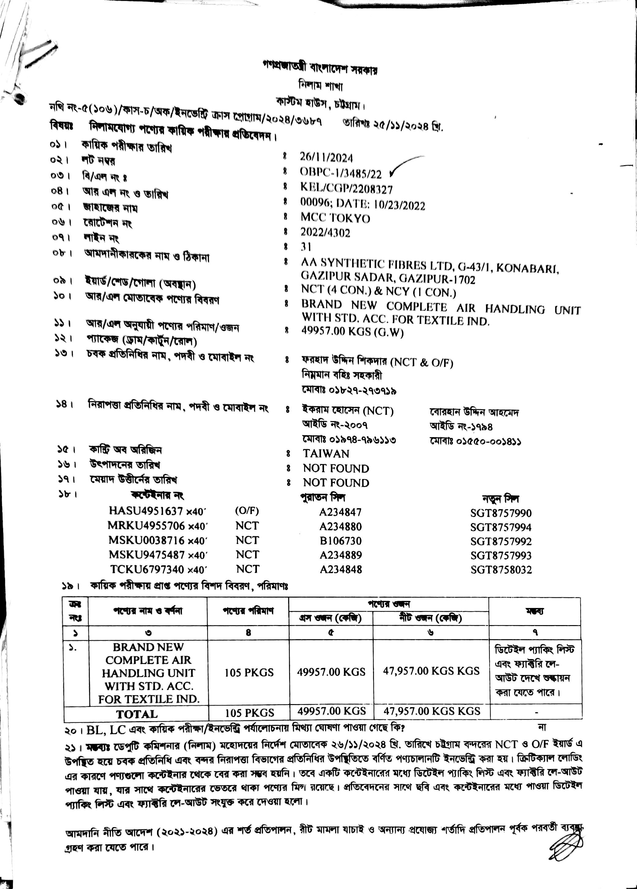 Terms & condition : আমদানি নীতি আদেশ এবং বিদ্যমান অন্যান্য আইন ও বিধি-বিধানের প্রযোজ্য সকল শর্ত পরিপালন এবং প্রযোজ্য ক্ষেত্রে রাসায়নিক পরীক্ষায় পণ্যের সঠিকতা ও ব্যবহার উপযোগিতা থাকা সাপেক্ষে খালাসকালে পণ্যের বর্ণনা এবং ওজন নিশ্চিত করে পণ্য ছাড়যোগ্য হবে। কোন লটভুক্ত পণ্যচালানে মেয়াদ উত্তীর্ণ/ধ্বসংযোগ্য পণ্য অন্তর্ভুক্ত থাকলে, উক্ত পণ্যচালানের ক্ষেত্রে মেয়াদ উত্তীর্ণ/ধ্বসংযোগ্য পণ্য ব্যতীত (প্রযোজ্য ক্ষেত্রে) কেবল মেয়াদযুক্ত/নিলামযোগ্য পণ্যসমূহ বিদ্যমান ও প্রযোজ্য আইন ও বিধি-বিধানের প্রযোজ্য সকল শর্ত পরিপালন সাপেক্ষে পণ্য ছাড়যোগ্য হবে। সার্ভার জটিলতা এড়ানোর জন্য আগ্রহী নিলাম ক্রেতাগণকে সরেজমিন পণ্য দেখে নিলামের নির্ধারিত শেষ তারিখ ও সময়ের (২৪/১২/২০২৫ খ্রি. তারিখ দুপুর ০২.০০ টা) পূর্বেই বিশেষ ই-নিলামে অংশগ্রহণ করার জন্য অনুরোধ করা যাচ্ছে। কোনরূপ কারণ দর্শানো ব্যতিরেকে কর্তৃপক্ষ যে কোন সময় ও পর্যায়ে যে কোন লট বা সকল লটের নিলাম আংশিক বা সম্পূর্ণ স্থগিত বা বাতিলের অধিকার সংরক্ষণ করেন।