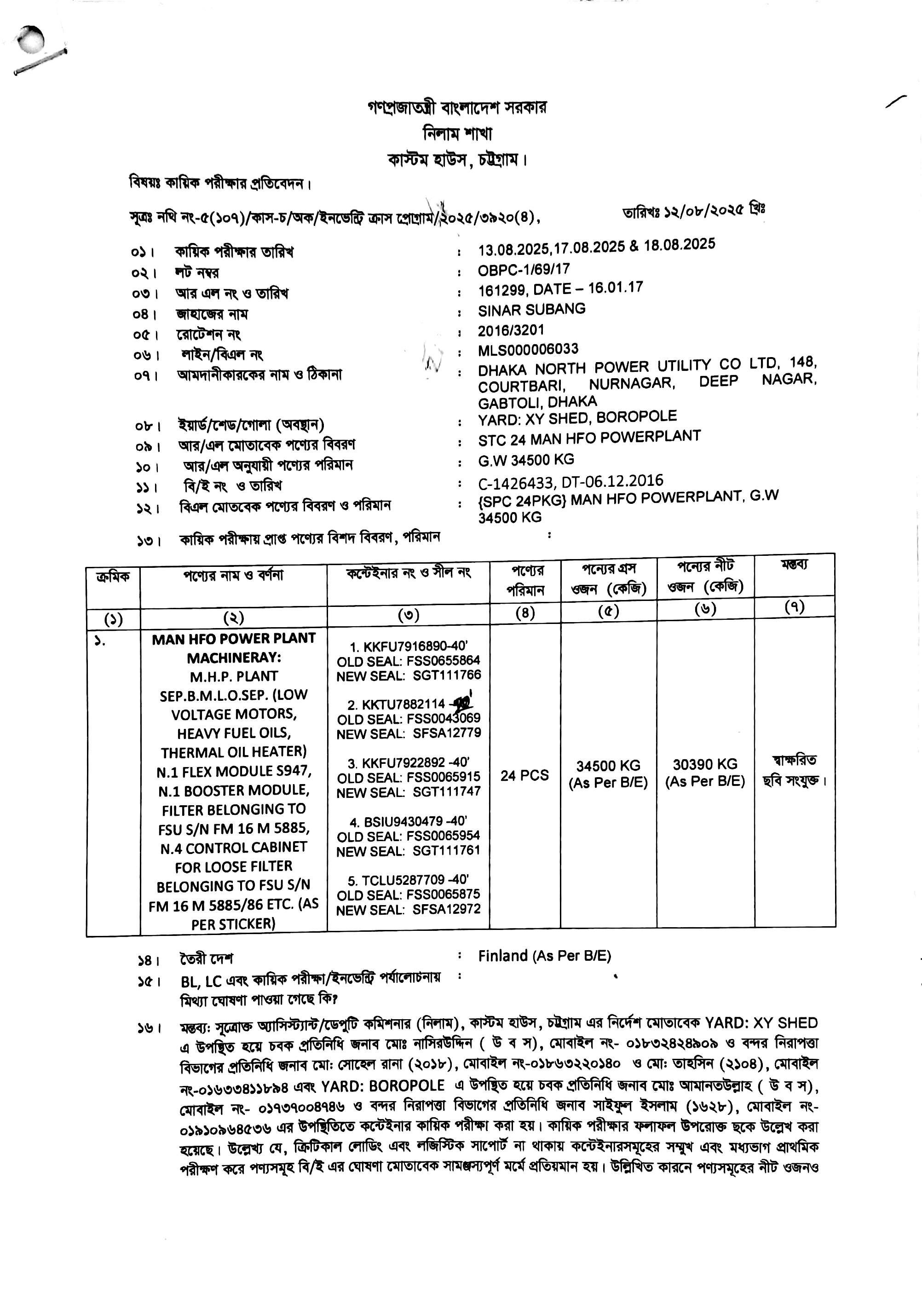 লটের শিরোনাম :Man HFO Power Plant Machinery(Previous Bid: 0 TK)