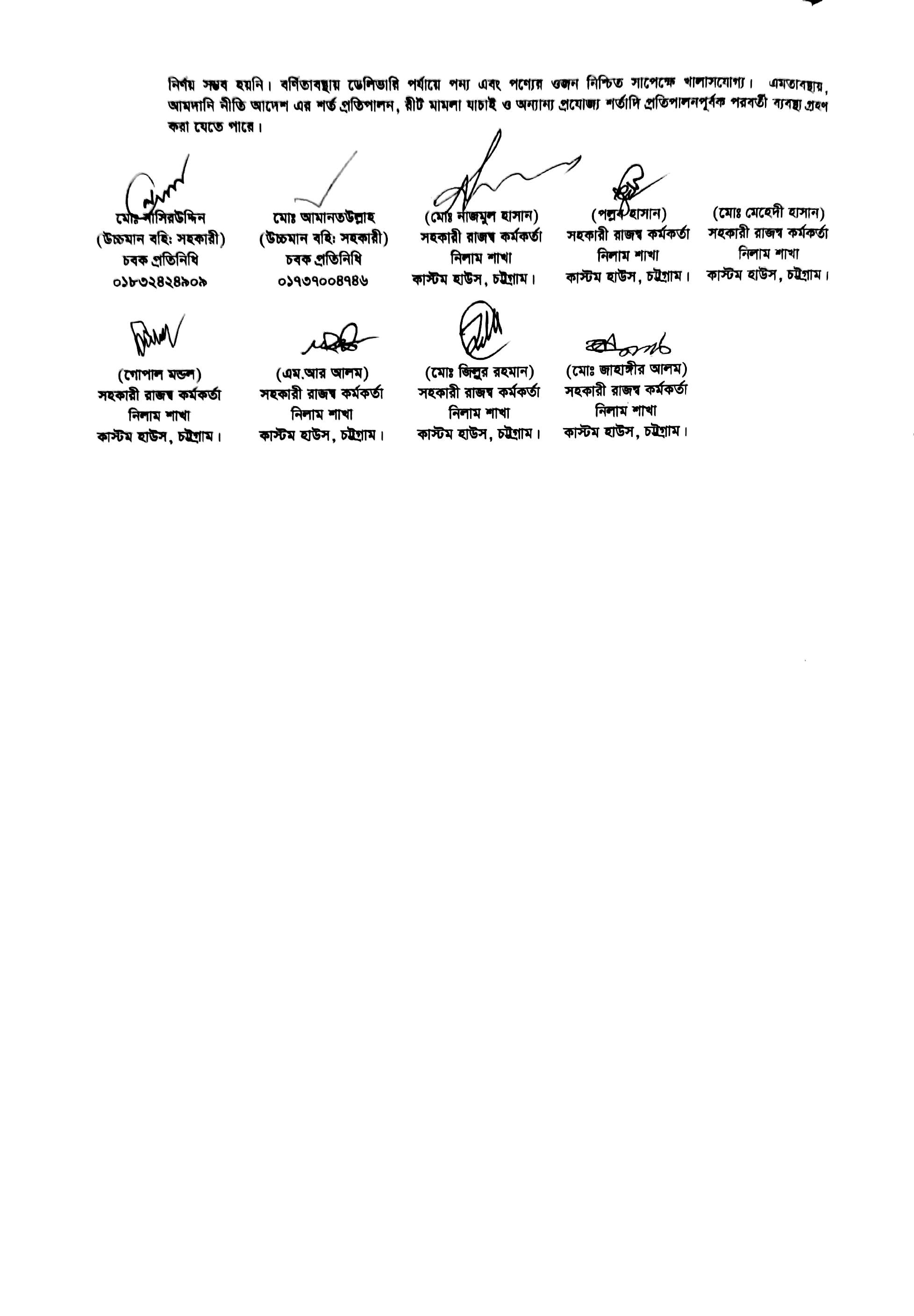 Terms & condition : আমদানি নীতি আদেশ এবং বিদ্যমান অন্যান্য আইন ও বিধি-বিধানের প্রযোজ্য সকল শর্ত পরিপালন এবং প্রযোজ্য ক্ষেত্রে রাসায়নিক পরীক্ষায় পণ্যের সঠিকতা ও ব্যবহার উপযোগিতা থাকা সাপেক্ষে খালাসকালে পণ্যের বর্ণনা এবং ওজন নিশ্চিত করে পণ্য ছাড়যোগ্য হবে। কোন লটভুক্ত পণ্যচালানে মেয়াদ উত্তীর্ণ/ধ্বসংযোগ্য পণ্য অন্তর্ভুক্ত থাকলে, উক্ত পণ্যচালানের ক্ষেত্রে মেয়াদ উত্তীর্ণ/ধ্বসংযোগ্য পণ্য ব্যতীত (প্রযোজ্য ক্ষেত্রে) কেবল মেয়াদযুক্ত/নিলামযোগ্য পণ্যসমূহ বিদ্যমান ও প্রযোজ্য আইন ও বিধি-বিধানের প্রযোজ্য সকল শর্ত পরিপালন সাপেক্ষে পণ্য ছাড়যোগ্য হবে। সার্ভার জটিলতা এড়ানোর জন্য আগ্রহী নিলাম ক্রেতাগণকে সরেজমিন পণ্য দেখে নিলামের নির্ধারিত শেষ তারিখ ও সময়ের (২৪/১২/২০২৫ খ্রি. তারিখ দুপুর ০২.০০ টা) পূর্বেই বিশেষ ই-নিলামে অংশগ্রহণ করার জন্য অনুরোধ করা যাচ্ছে। কোনরূপ কারণ দর্শানো ব্যতিরেকে কর্তৃপক্ষ যে কোন সময় ও পর্যায়ে যে কোন লট বা সকল লটের নিলাম আংশিক বা সম্পূর্ণ স্থগিত বা বাতিলের অধিকার সংরক্ষণ করেন।