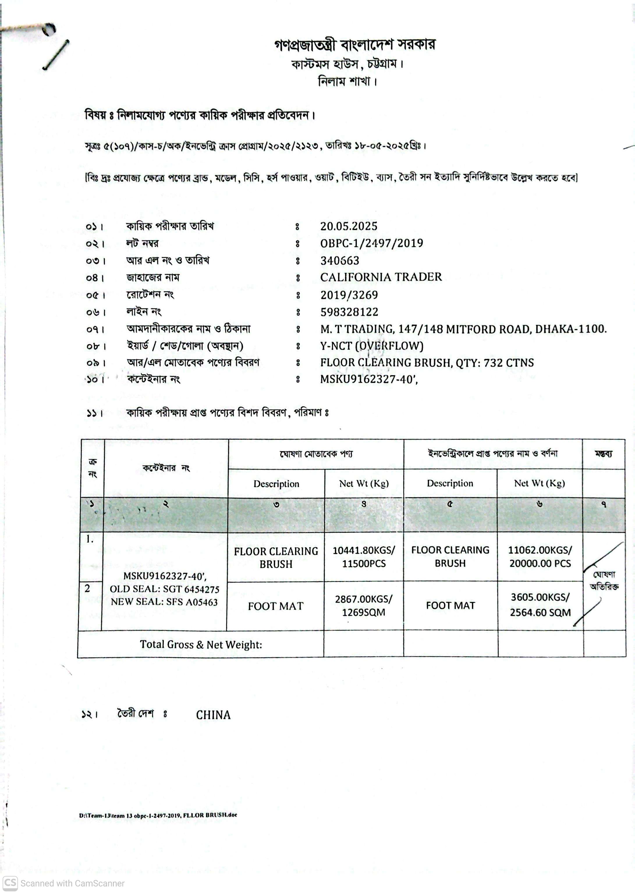লটের শিরোনাম :(1) Floor Clearing Brush= 11,062 Kgs/20,000 Pcs; (2) Foot Mat= 3,605 Kgs/2564.60 Sqm(Previous Bid: 0 TK)