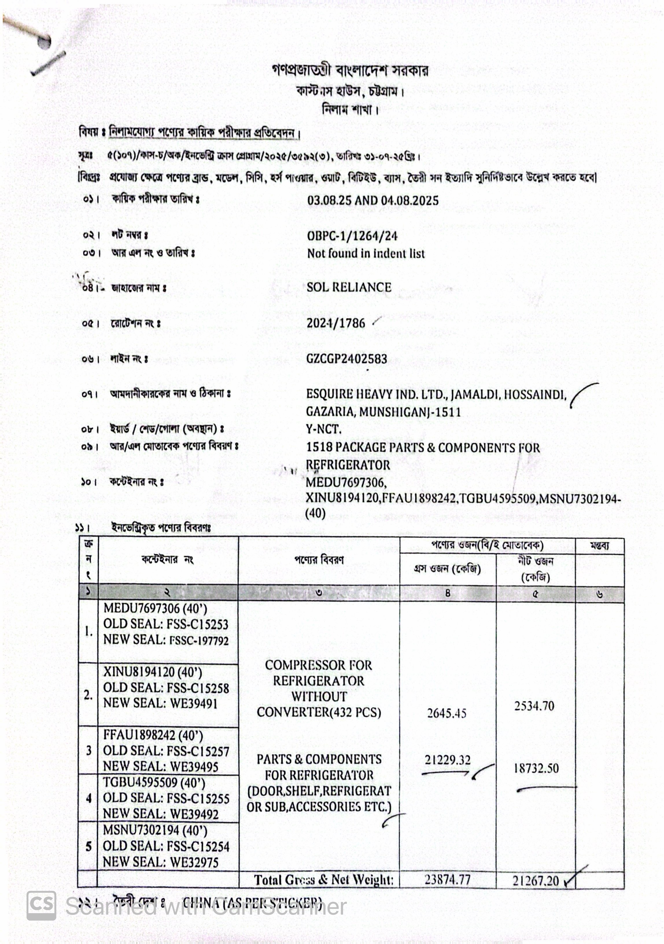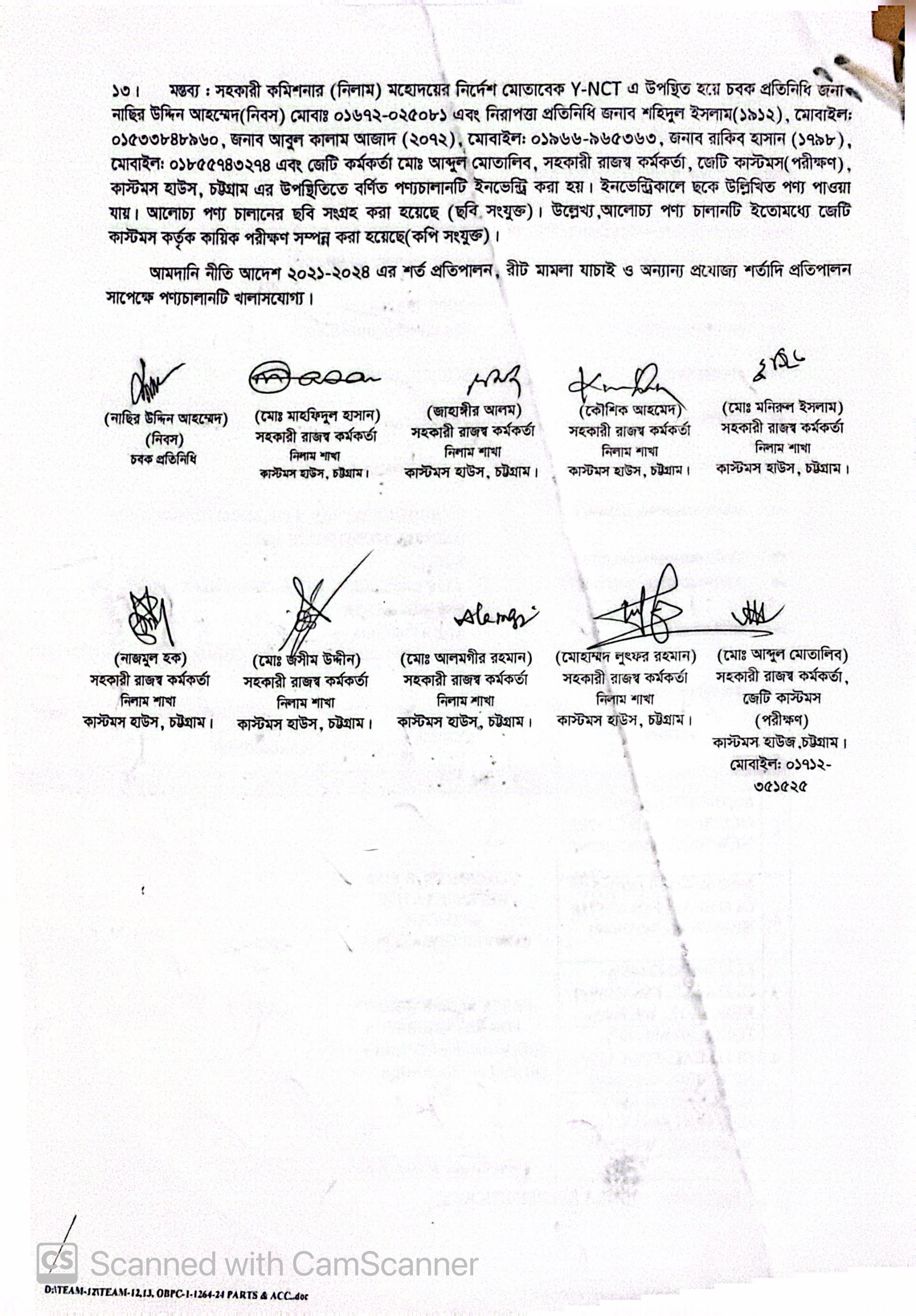 Terms & condition : আমদানি নীতি আদেশ এবং বিদ্যমান অন্যান্য আইন ও বিধি-বিধানের প্রযোজ্য সকল শর্ত পরিপালন এবং প্রযোজ্য ক্ষেত্রে রাসায়নিক পরীক্ষায় পণ্যের সঠিকতা ও ব্যবহার উপযোগিতা থাকা সাপেক্ষে খালাসকালে পণ্যের বর্ণনা এবং ওজন নিশ্চিত করে পণ্য ছাড়যোগ্য হবে। কোন লটভুক্ত পণ্যচালানে মেয়াদ উত্তীর্ণ/ধ্বসংযোগ্য পণ্য অন্তর্ভুক্ত থাকলে, উক্ত পণ্যচালানের ক্ষেত্রে মেয়াদ উত্তীর্ণ/ধ্বসংযোগ্য পণ্য ব্যতীত (প্রযোজ্য ক্ষেত্রে) কেবল মেয়াদযুক্ত/নিলামযোগ্য পণ্যসমূহ বিদ্যমান ও প্রযোজ্য আইন ও বিধি-বিধানের প্রযোজ্য সকল শর্ত পরিপালন সাপেক্ষে পণ্য ছাড়যোগ্য হবে। সার্ভার জটিলতা এড়ানোর জন্য আগ্রহী নিলাম ক্রেতাগণকে সরেজমিন পণ্য দেখে নিলামের নির্ধারিত তারিখ ও সময় শেষ হওয়ার পূর্বেই ই-নিলামে অংশগ্রহণ করার জন্য অনুরোধ করা যাচ্ছে। কোনরূপ কারণ দর্শানো ব্যতিরেকে কর্তৃপক্ষ যে কোন সময় ও পর্যায়ে যে কোন লট বা সকল লটের নিলাম আংশিক বা সম্পূর্ণ স্থগিত বা বাতিলের অধিকার সংরক্ষণ করেন।