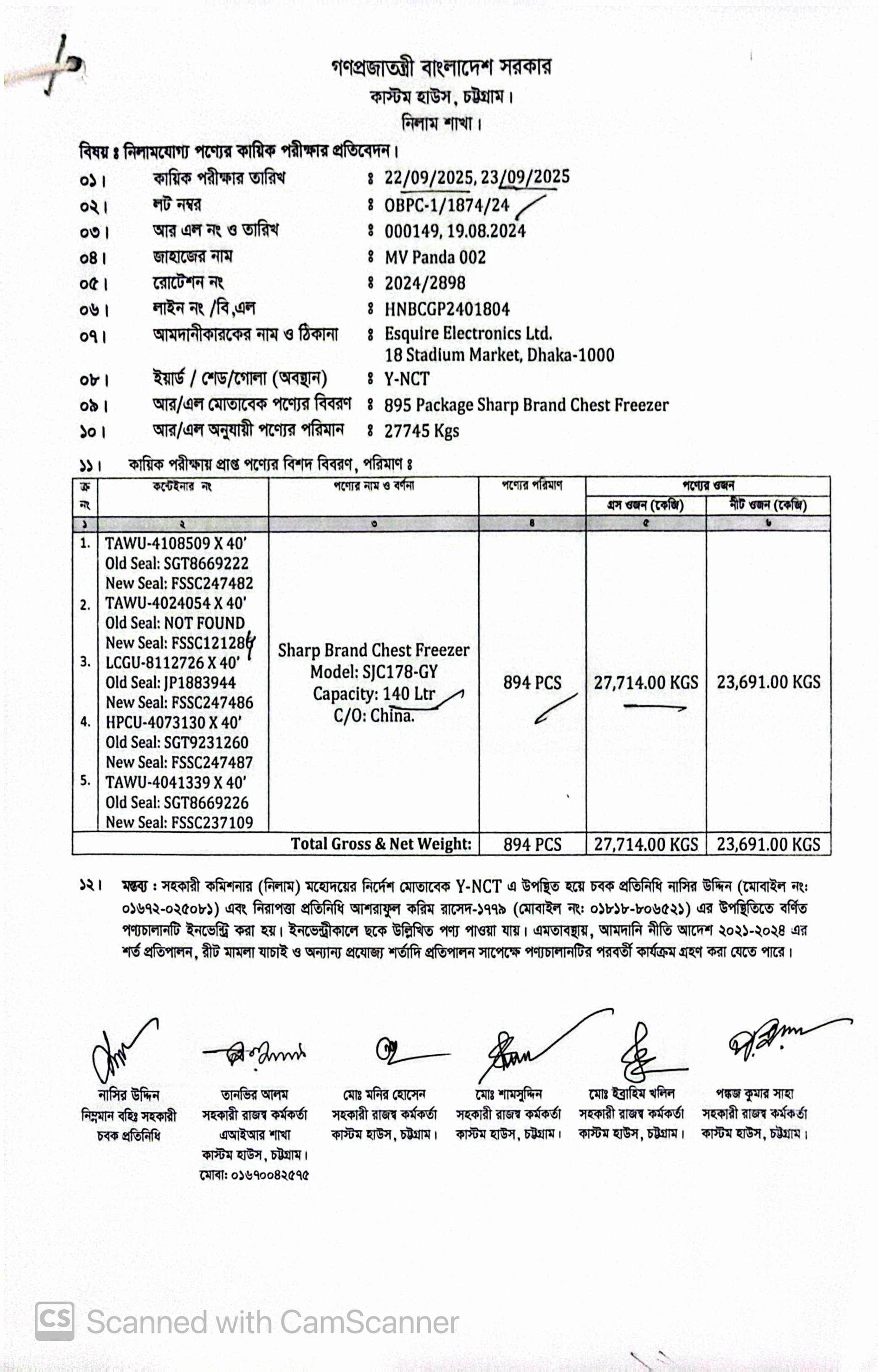 Terms & condition : আমদানি নীতি আদেশ এবং বিদ্যমান অন্যান্য আইন ও বিধি-বিধানের প্রযোজ্য সকল শর্ত পরিপালন এবং প্রযোজ্য ক্ষেত্রে রাসায়নিক পরীক্ষায় পণ্যের সঠিকতা ও ব্যবহার উপযোগিতা থাকা সাপেক্ষে খালাসকালে পণ্যের বর্ণনা এবং ওজন নিশ্চিত করে পণ্য ছাড়যোগ্য হবে। কোন লটভুক্ত পণ্যচালানে মেয়াদ উত্তীর্ণ/ধ্বসংযোগ্য পণ্য অন্তর্ভুক্ত থাকলে, উক্ত পণ্যচালানের ক্ষেত্রে মেয়াদ উত্তীর্ণ/ধ্বসংযোগ্য পণ্য ব্যতীত (প্রযোজ্য ক্ষেত্রে) কেবল মেয়াদযুক্ত/নিলামযোগ্য পণ্যসমূহ বিদ্যমান ও প্রযোজ্য আইন ও বিধি-বিধানের প্রযোজ্য সকল শর্ত পরিপালন সাপেক্ষে পণ্য ছাড়যোগ্য হবে। সার্ভার জটিলতা এড়ানোর জন্য আগ্রহী নিলাম ক্রেতাগণকে সরেজমিন পণ্য দেখে নিলামের নির্ধারিত তারিখ ও সময় শেষ হওয়ার পূর্বেই ই-নিলামে অংশগ্রহণ করার জন্য অনুরোধ করা যাচ্ছে। কোনরূপ কারণ দর্শানো ব্যতিরেকে কর্তৃপক্ষ যে কোন সময় ও পর্যায়ে যে কোন লট বা সকল লটের নিলাম আংশিক বা সম্পূর্ণ স্থগিত বা বাতিলের অধিকার সংরক্ষণ করেন।