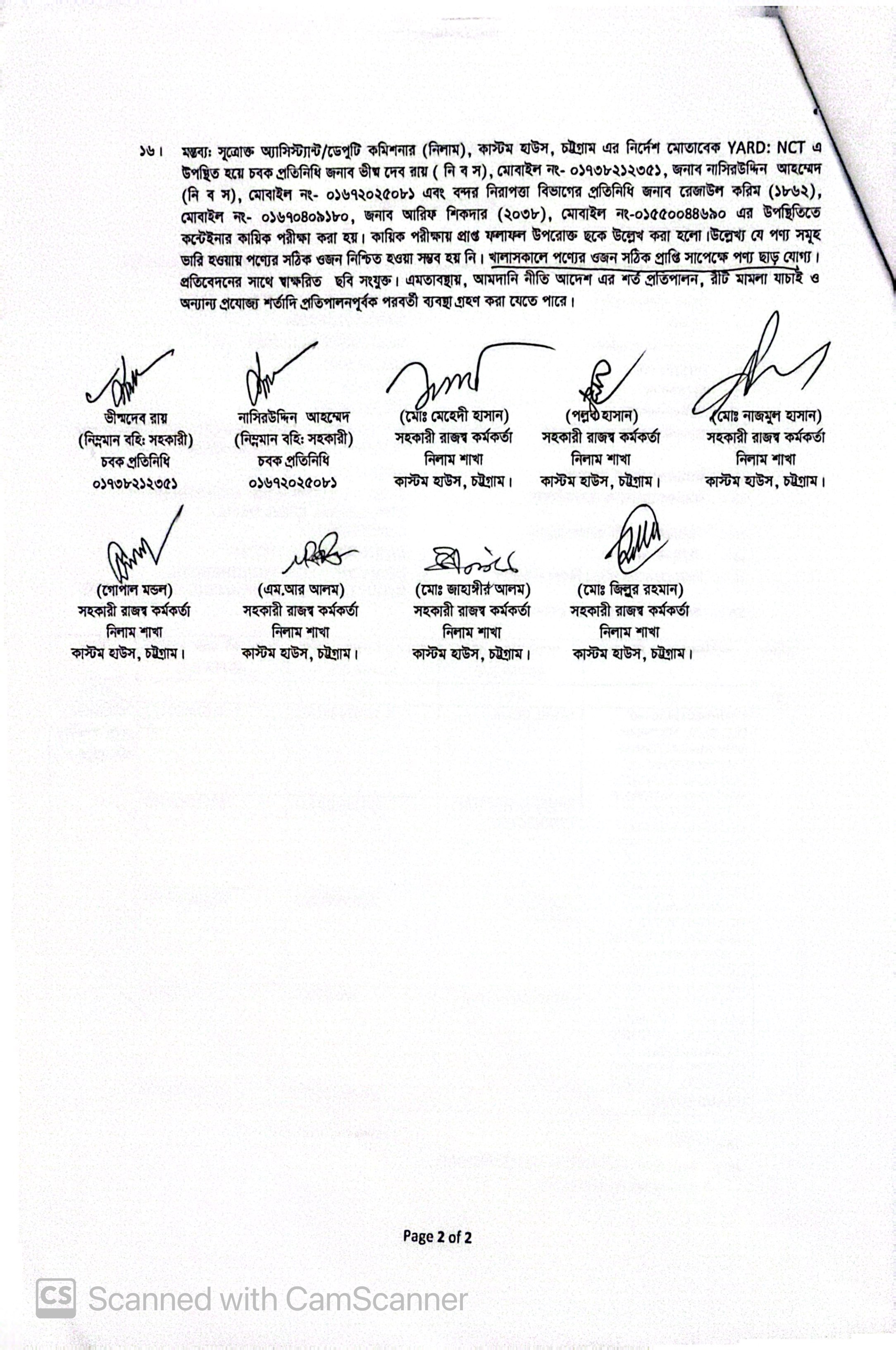 Terms & condition : আমদানি নীতি আদেশ এবং বিদ্যমান অন্যান্য আইন ও বিধি-বিধানের প্রযোজ্য সকল শর্ত পরিপালন এবং প্রযোজ্য ক্ষেত্রে রাসায়নিক পরীক্ষায় পণ্যের সঠিকতা ও ব্যবহার উপযোগিতা থাকা সাপেক্ষে খালাসকালে পণ্যের বর্ণনা এবং ওজন নিশ্চিত করে পণ্য ছাড়যোগ্য হবে। কোন লটভুক্ত পণ্যচালানে মেয়াদ উত্তীর্ণ/ধ্বসংযোগ্য পণ্য অন্তর্ভুক্ত থাকলে, উক্ত পণ্যচালানের ক্ষেত্রে মেয়াদ উত্তীর্ণ/ধ্বসংযোগ্য পণ্য ব্যতীত (প্রযোজ্য ক্ষেত্রে) কেবল মেয়াদযুক্ত/নিলামযোগ্য পণ্যসমূহ বিদ্যমান ও প্রযোজ্য আইন ও বিধি-বিধানের প্রযোজ্য সকল শর্ত পরিপালন সাপেক্ষে পণ্য ছাড়যোগ্য হবে। সার্ভার জটিলতা এড়ানোর জন্য আগ্রহী নিলাম ক্রেতাগণকে সরেজমিন পণ্য দেখে নিলামের নির্ধারিত তারিখ ও সময় শেষ হওয়ার পূর্বেই ই-নিলামে অংশগ্রহণ করার জন্য অনুরোধ করা যাচ্ছে। কোনরূপ কারণ দর্শানো ব্যতিরেকে কর্তৃপক্ষ যে কোন সময় ও পর্যায়ে যে কোন লট বা সকল লটের নিলাম আংশিক বা সম্পূর্ণ স্থগিত বা বাতিলের অধিকার সংরক্ষণ করেন।