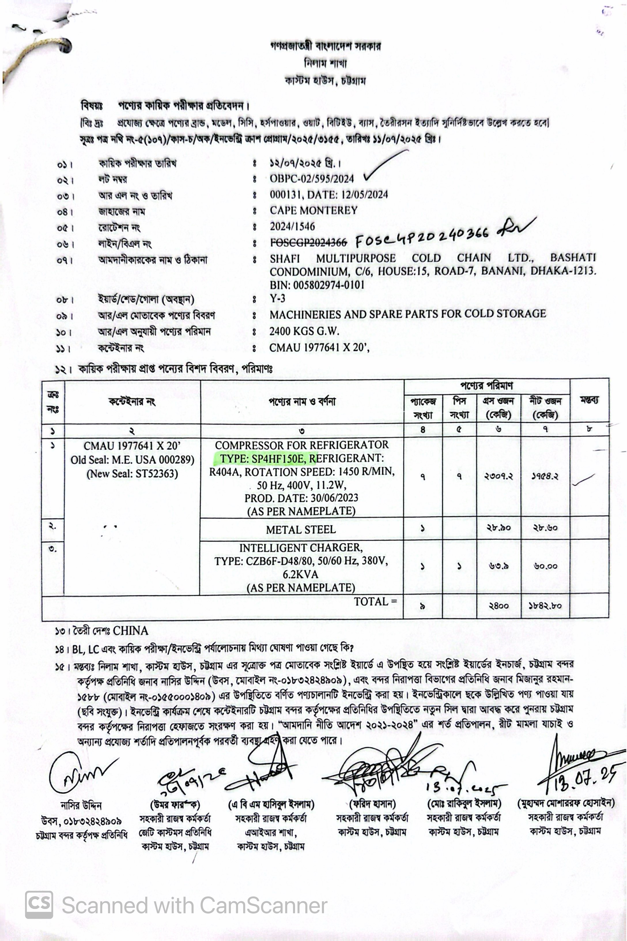 লটের শিরোনাম :COMPRESSOR FOR REFRIGERATOR METAL STEEL INTELLIGENT CHARGER TYPE : CZB6F-D48/80, 50/60 HZ, 380V, 6.2KVA (AS PER NAMEPLATE)(Previous Bid: 0 TK)