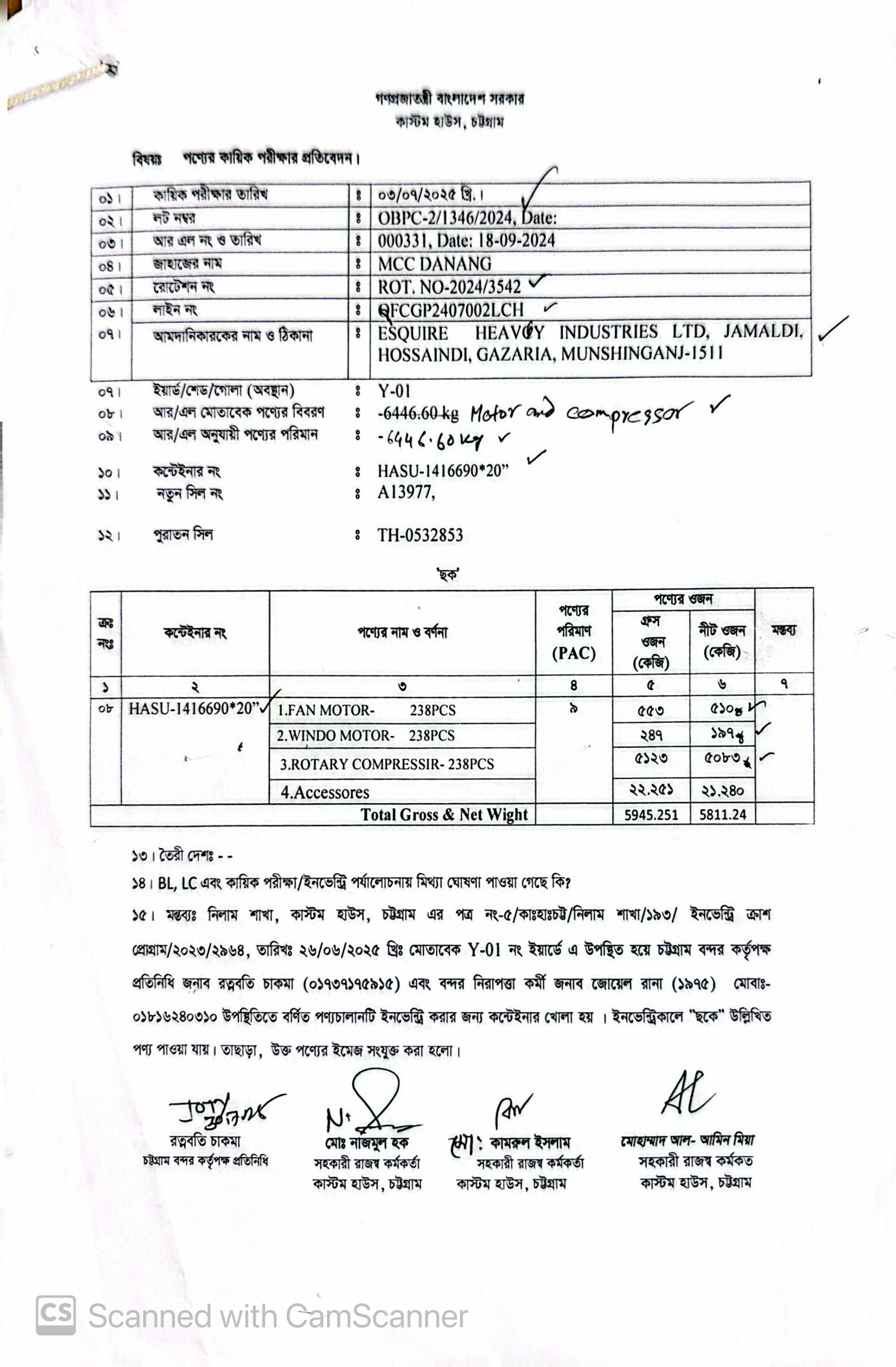Terms & condition : আমদানি নীতি আদেশ এবং বিদ্যমান অন্যান্য আইন ও বিধি-বিধানের প্রযোজ্য সকল শর্ত পরিপালন এবং প্রযোজ্য ক্ষেত্রে রাসায়নিক পরীক্ষায় পণ্যের সঠিকতা ও ব্যবহার উপযোগিতা থাকা সাপেক্ষে খালাসকালে পণ্যের বর্ণনা এবং ওজন নিশ্চিত করে পণ্য ছাড়যোগ্য হবে। কোন লটভুক্ত পণ্যচালানে মেয়াদ উত্তীর্ণ/ধ্বসংযোগ্য পণ্য অন্তর্ভুক্ত থাকলে, উক্ত পণ্যচালানের ক্ষেত্রে মেয়াদ উত্তীর্ণ/ধ্বসংযোগ্য পণ্য ব্যতীত (প্রযোজ্য ক্ষেত্রে) কেবল মেয়াদযুক্ত/নিলামযোগ্য পণ্যসমূহ বিদ্যমান ও প্রযোজ্য আইন ও বিধি-বিধানের প্রযোজ্য সকল শর্ত পরিপালন সাপেক্ষে পণ্য ছাড়যোগ্য হবে। সার্ভার জটিলতা এড়ানোর জন্য আগ্রহী নিলাম ক্রেতাগণকে সরেজমিন পণ্য দেখে নিলামের নির্ধারিত তারিখ ও সময় শেষ হওয়ার পূর্বেই ই-নিলামে অংশগ্রহণ করার জন্য অনুরোধ করা যাচ্ছে। কোনরূপ কারণ দর্শানো ব্যতিরেকে কর্তৃপক্ষ যে কোন সময় ও পর্যায়ে যে কোন লট বা সকল লটের নিলাম আংশিক বা সম্পূর্ণ স্থগিত বা বাতিলের অধিকার সংরক্ষণ করেন।