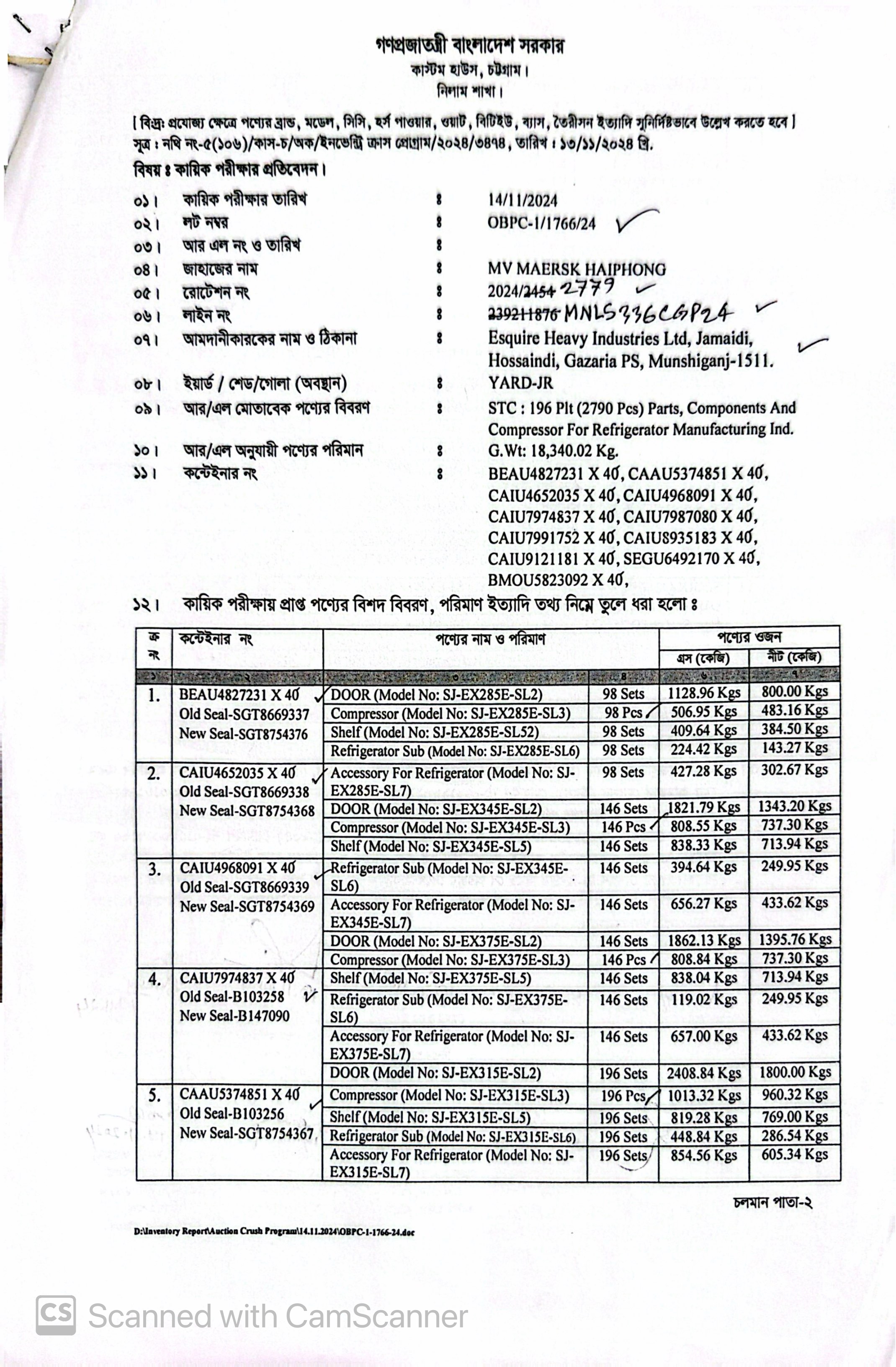 | কন্টেনার/জি আর নং |