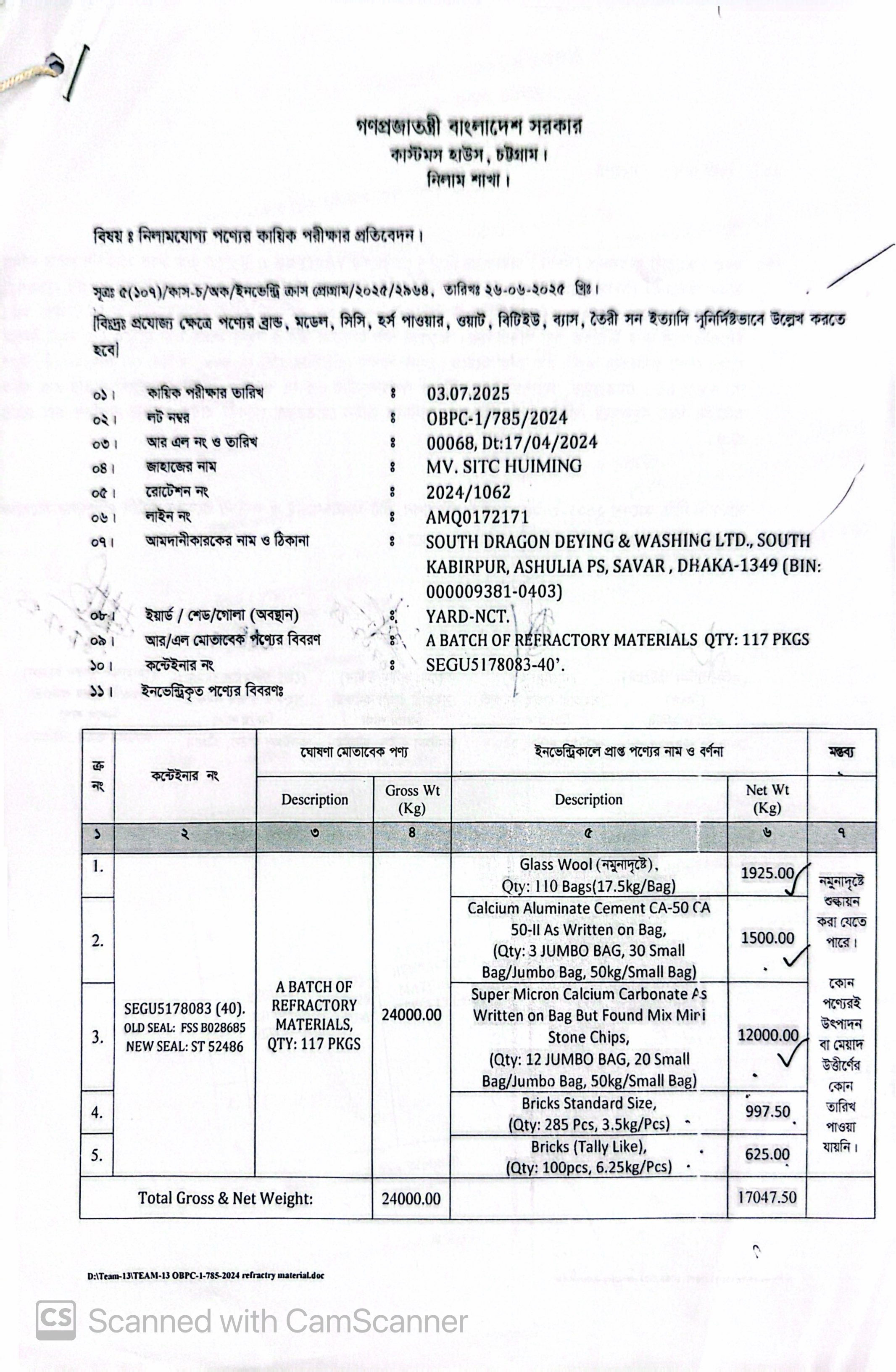 লটের শিরোনাম :GLASS WOOL CALCIUM ALUMINATE CEMENT SUPER MICRON CALCIUM CARONATE AS WRITEN ON BAG BUT FOUND MIX MIRI STONE CHIPS BRICKS STANDARD & BRICKS (TALLY LIKE)(Previous Bid: 0 TK)