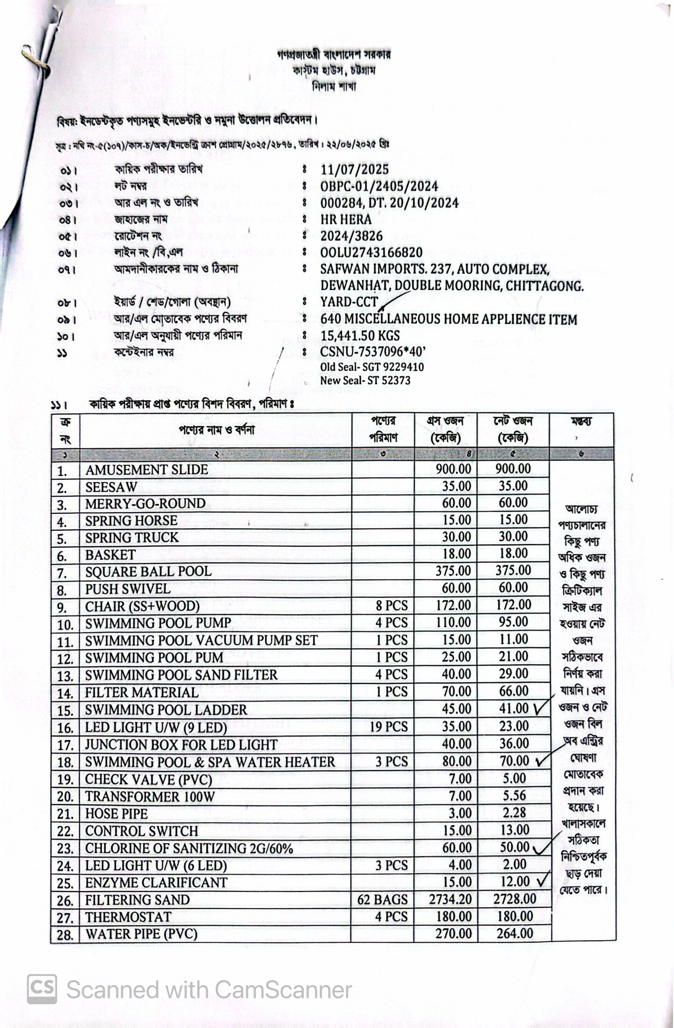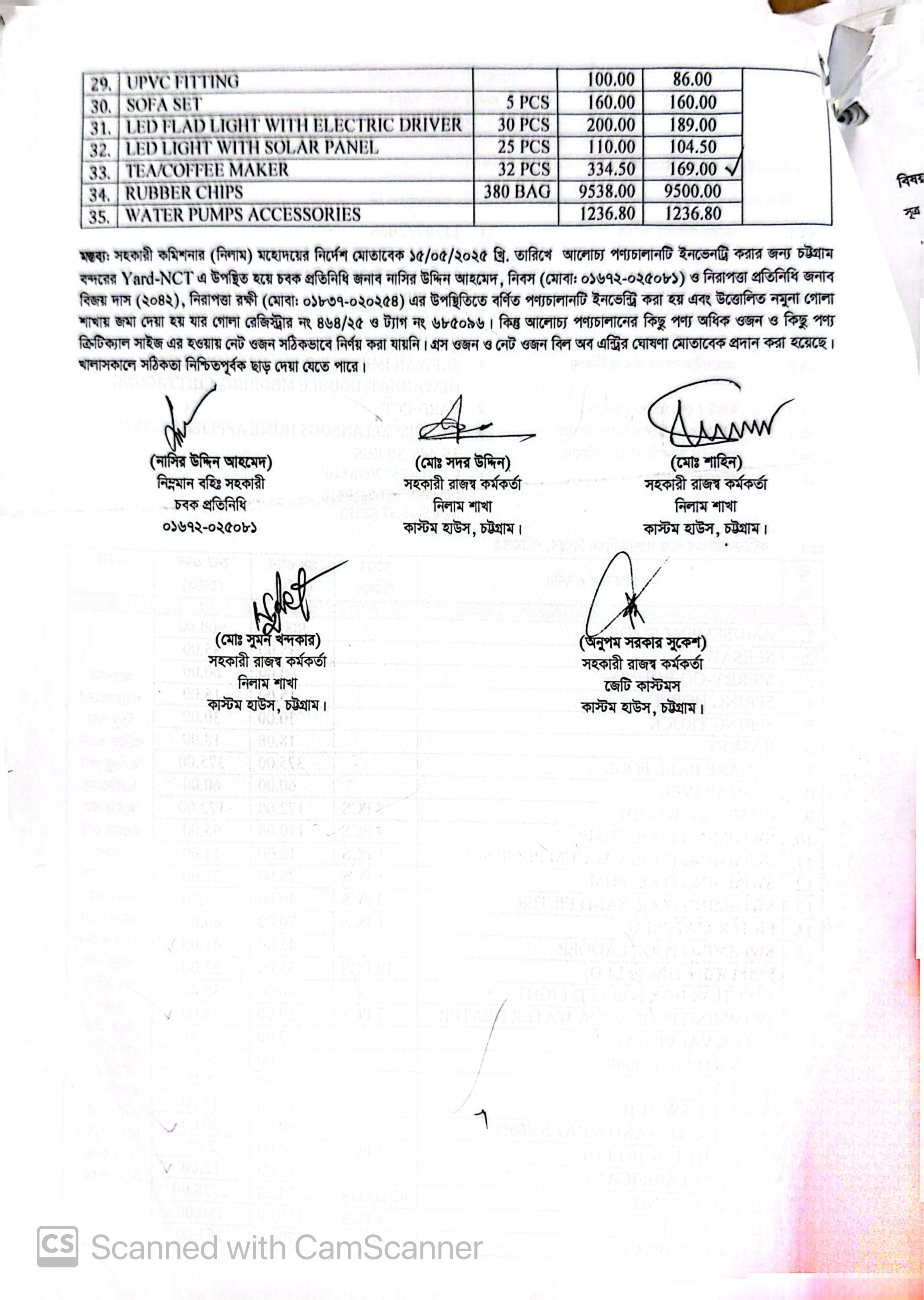 Terms & condition : আমদানি নীতি আদেশ এবং বিদ্যমান অন্যান্য আইন ও বিধি-বিধানের প্রযোজ্য সকল শর্ত পরিপালন এবং প্রযোজ্য ক্ষেত্রে রাসায়নিক পরীক্ষায় পণ্যের সঠিকতা ও ব্যবহার উপযোগিতা থাকা সাপেক্ষে খালাসকালে পণ্যের বর্ণনা এবং ওজন নিশ্চিত করে পণ্য ছাড়যোগ্য হবে। কোন লটভুক্ত পণ্যচালানে মেয়াদ উত্তীর্ণ/ধ্বসংযোগ্য পণ্য অন্তর্ভুক্ত থাকলে, উক্ত পণ্যচালানের ক্ষেত্রে মেয়াদ উত্তীর্ণ/ধ্বসংযোগ্য পণ্য ব্যতীত (প্রযোজ্য ক্ষেত্রে) কেবল মেয়াদযুক্ত/নিলামযোগ্য পণ্যসমূহ বিদ্যমান ও প্রযোজ্য আইন ও বিধি-বিধানের প্রযোজ্য সকল শর্ত পরিপালন সাপেক্ষে পণ্য ছাড়যোগ্য হবে। সার্ভার জটিলতা এড়ানোর জন্য আগ্রহী নিলাম ক্রেতাগণকে সরেজমিন পণ্য দেখে নিলামের নির্ধারিত তারিখ ও সময় শেষ হওয়ার পূর্বেই ই-নিলামে অংশগ্রহণ করার জন্য অনুরোধ করা যাচ্ছে। কোনরূপ কারণ দর্শানো ব্যতিরেকে কর্তৃপক্ষ যে কোন সময় ও পর্যায়ে যে কোন লট বা সকল লটের নিলাম আংশিক বা সম্পূর্ণ স্থগিত বা বাতিলের অধিকার সংরক্ষণ করেন।