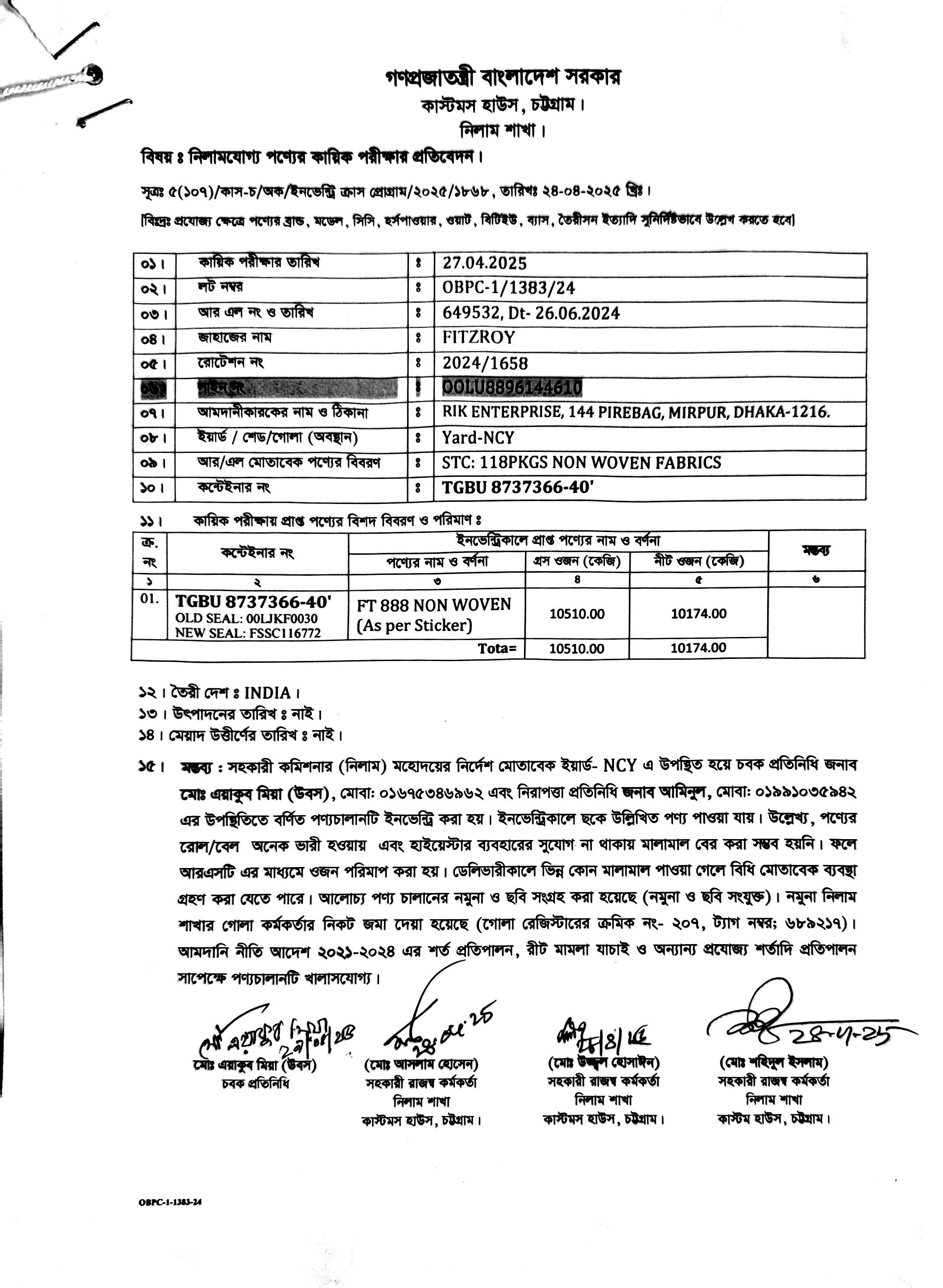 লটের শিরোনাম :FT 888 Non-Woven (As Per Sticker(Previous Bid: 0 TK)