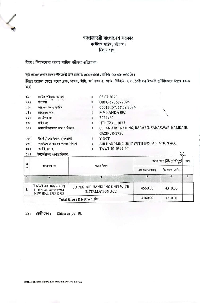 লটের শিরোনাম :AIR Handling Unit With Installation Acc. (Cooling Capacity – 282 KW as per embossed Sticker) - 08 Pkgs(Previous Bid: 0 TK)