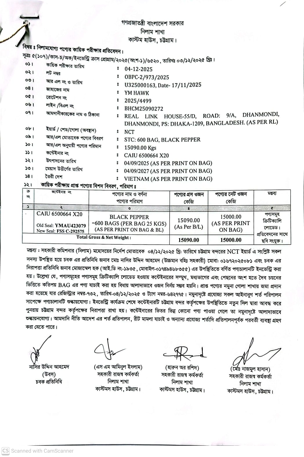 লটের শিরোনাম :BLACK PEPPER 600 BAGS (PER BAG 25 KGS). C/O: VIETNAM(Previous Bid: 0 TK)