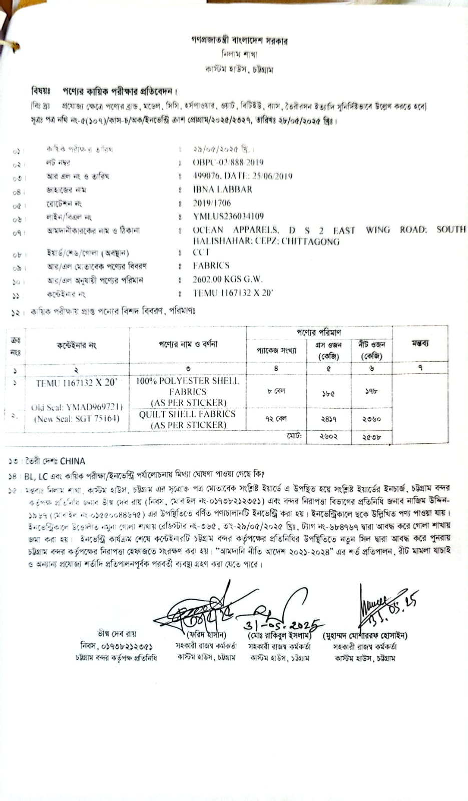 লটের শিরোনাম :Polyester Fabrics (See attached inventory report)(Previous Bid: 0 TK)