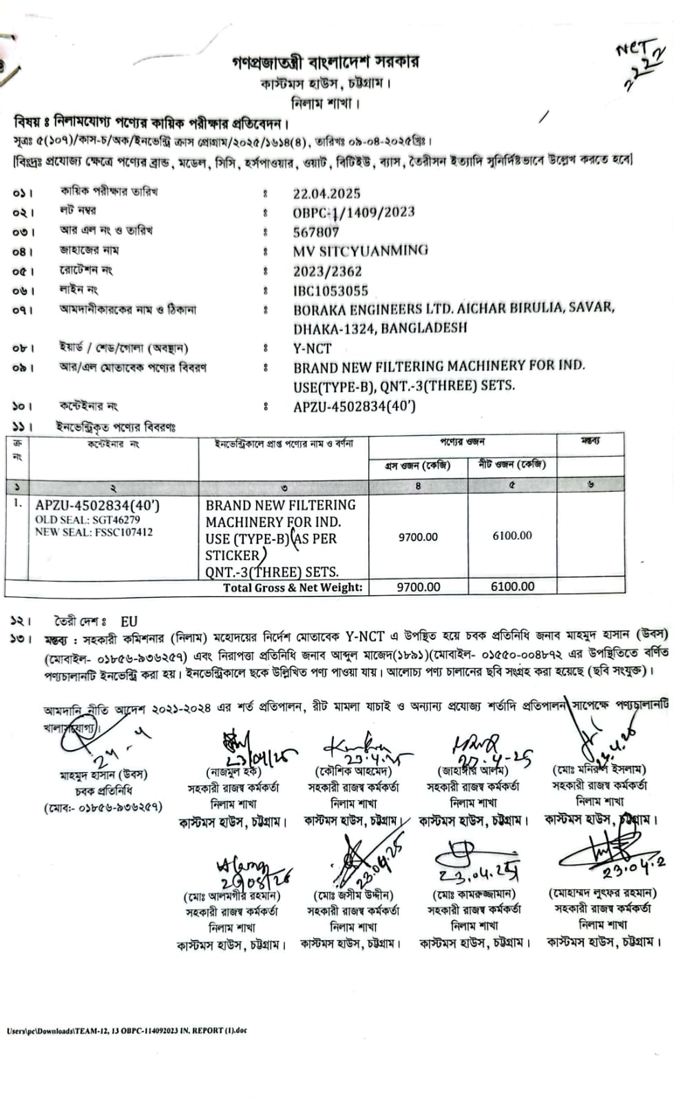 Terms & condition : আমদানি নীতি আদেশ এবং বিদ্যমান অন্যান্য আইন ও বিধি-বিধানের প্রযোজ্য সকল শর্ত পরিপালন এবং প্রযোজ্য ক্ষেত্রে রাসায়নিক পরীক্ষায় পণ্যের সঠিকতা ও ব্যবহার উপযোগিতা থাকা সাপেক্ষে খালাসকালে পণ্যের বর্ণনা এবং ওজন নিশ্চিত করে পণ্য ছাড়যোগ্য হবে। কোন লটভুক্ত পণ্যচালানে মেয়াদ উত্তীর্ণ/ধ্বসংযোগ্য পণ্য অন্তর্ভুক্ত থাকলে, উক্ত পণ্যচালানের ক্ষেত্রে মেয়াদ উত্তীর্ণ/ধ্বসংযোগ্য পণ্য ব্যতীত (প্রযোজ্য ক্ষেত্রে) কেবল মেয়াদযুক্ত/নিলামযোগ্য পণ্যসমূহ বিদ্যমান ও প্রযোজ্য আইন ও বিধি-বিধানের প্রযোজ্য সকল শর্ত পরিপালন সাপেক্ষে পণ্য ছাড়যোগ্য হবে। সার্ভার জটিলতা এড়ানোর জন্য আগ্রহী নিলাম ক্রেতাগণকে সরেজমিন পণ্য দেখে নিলামের নির্ধারিত তারিখ ও সময় শেষ হওয়ার পূর্বেই ই-নিলামে অংশগ্রহণ করার জন্য অনুরোধ করা যাচ্ছে। কোনরূপ কারণ দর্শানো ব্যতিরেকে কর্তৃপক্ষ যে কোন সময় ও পর্যায়ে যে কোন লট বা সকল লটের নিলাম আংশিক বা সম্পূর্ণ স্থগিত বা বাতিলের অধিকার সংরক্ষণ করেন।