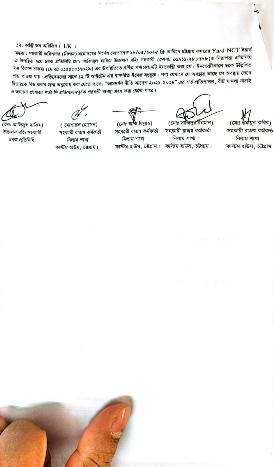 Terms & condition : আমদানি নীতি আদেশ এবং বিদ্যমান অন্যান্য আইন ও বিধি-বিধানের প্রযোজ্য সকল শর্ত পরিপালন এবং প্রযোজ্য ক্ষেত্রে রাসায়নিক পরীক্ষায় পণ্যের সঠিকতা ও ব্যবহার উপযোগিতা থাকা সাপেক্ষে খালাসকালে পণ্যের বর্ণনা এবং ওজন নিশ্চিত করে পণ্য ছাড়যোগ্য হবে। কোন লটভুক্ত পণ্যচালানে মেয়াদ উত্তীর্ণ/ধ্বসংযোগ্য পণ্য অন্তর্ভুক্ত থাকলে, উক্ত পণ্যচালানের ক্ষেত্রে মেয়াদ উত্তীর্ণ/ধ্বসংযোগ্য পণ্য ব্যতীত (প্রযোজ্য ক্ষেত্রে) কেবল মেয়াদযুক্ত/নিলামযোগ্য পণ্যসমূহ বিদ্যমান ও প্রযোজ্য আইন ও বিধি-বিধানের প্রযোজ্য সকল শর্ত পরিপালন সাপেক্ষে পণ্য ছাড়যোগ্য হবে। সার্ভার জটিলতা এড়ানোর জন্য আগ্রহী নিলাম ক্রেতাগণকে সরেজমিন পণ্য দেখে নিলামের নির্ধারিত তারিখ ও সময় শেষ হওয়ার পূর্বেই ই-নিলামে অংশগ্রহণ করার জন্য অনুরোধ করা যাচ্ছে। কোনরূপ কারণ দর্শানো ব্যতিরেকে কর্তৃপক্ষ যে কোন সময় ও পর্যায়ে যে কোন লট বা সকল লটের নিলাম আংশিক বা সম্পূর্ণ স্থগিত বা বাতিলের অধিকার সংরক্ষণ করেন।