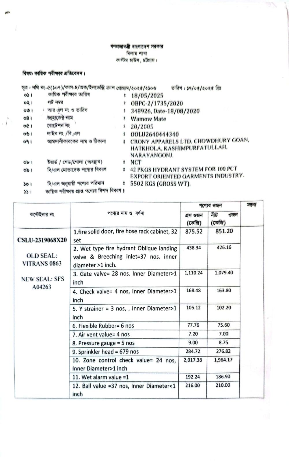 (1) Fire Solid Door, Fire Hose Rack Cabinet-32 Set= 851.20 Kg; (2) Wet type fire hydrant oblique landing valve & Breeching inlet= 37 nos. inner diameter>1 inch: 426.16 Kg; (3) Gate Valve= 28 nos. Inner Diameter>1 inch: 1,079.40 Kg; (4) Check Valve= 4 nos. Inner Diameter>1 inch: 163.80 Kg; (5) Y Strainer= 3 nos. Inner Diameter>1 inch: 102.20 Kg; (6) Flexible Rubber= 6 Nos: 75.60 Kg; (7) Air vent Valve= 4 nos. 7 Kg; (8) Pressure Gauge= 5 Nos. 8.75 Kg; (9) Sprinkler Head= 679 Nos. 276.82 Kg; (10) Zone Control Check Valve= 24 nos. Inner Diameter>1 inch: 1,964.17 Kg; (11) Wet Alarm Valve=1 Nos. 186.90 Kg; (12) Ball Valve= 37 nos. Inner Diameter<1 inch: 210 Kg. C/O: UK |