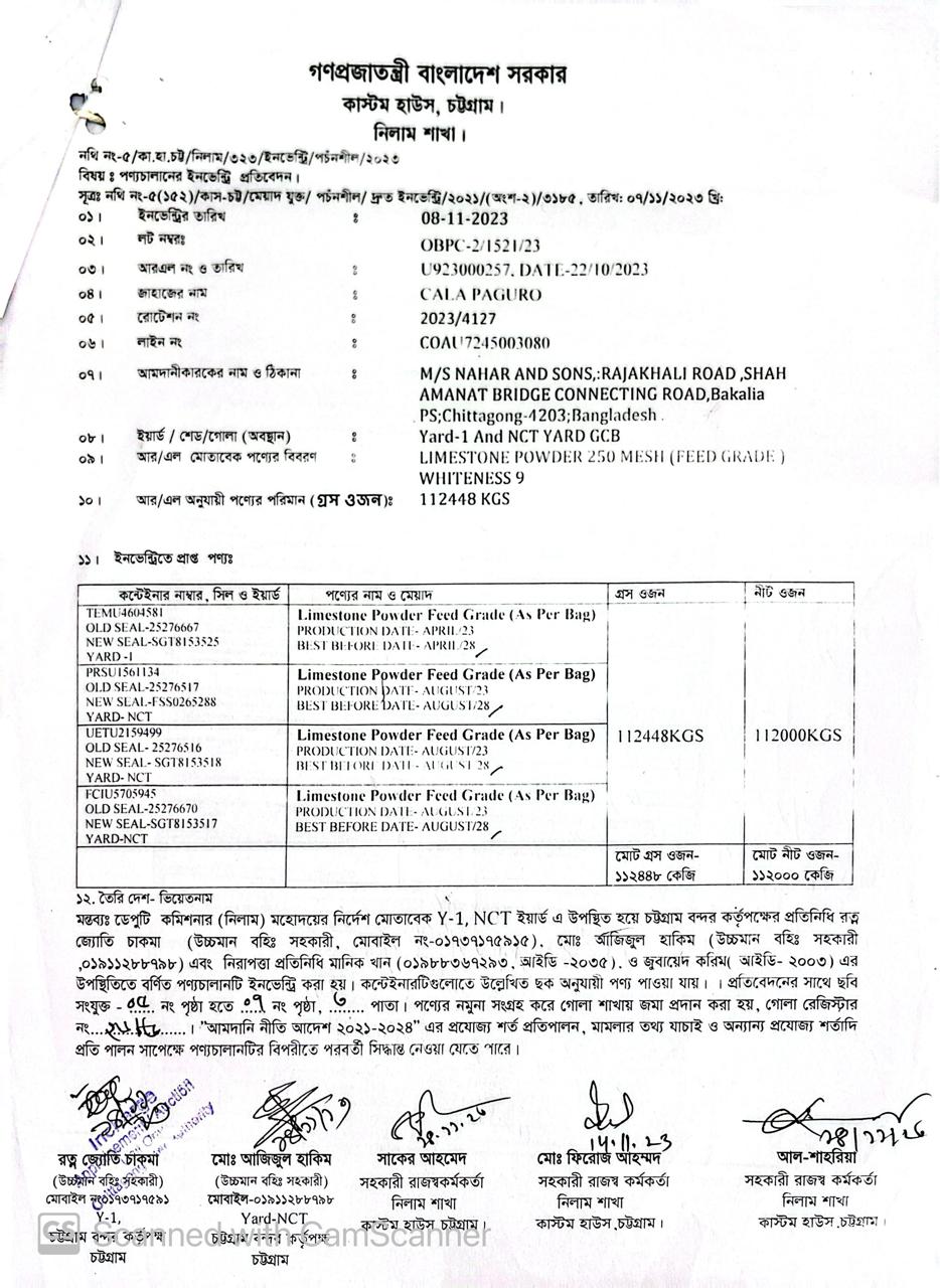 Terms & condition : আমদানি নীতি আদেশ এবং বিদ্যমান অন্যান্য আইন ও বিধি-বিধানের প্রযোজ্য সকল শর্ত পরিপালন এবং প্রযোজ্য ক্ষেত্রে রাসায়নিক পরীক্ষায় পণ্যের সঠিকতা ও ব্যবহার উপযোগিতা থাকা সাপেক্ষে খালাসকালে পণ্যের বর্ণনা এবং ওজন নিশ্চিত করে পণ্য ছাড়যোগ্য হবে। কোন লটভুক্ত পণ্যচালানে মেয়াদ উত্তীর্ণ/ধ্বসংযোগ্য পণ্য অন্তর্ভুক্ত থাকলে, উক্ত পণ্যচালানের ক্ষেত্রে মেয়াদ উত্তীর্ণ/ধ্বসংযোগ্য পণ্য ব্যতীত (প্রযোজ্য ক্ষেত্রে) কেবল মেয়াদযুক্ত/নিলামযোগ্য পণ্যসমূহ বিদ্যমান ও প্রযোজ্য আইন ও বিধি-বিধানের প্রযোজ্য সকল শর্ত পরিপালন সাপেক্ষে পণ্য ছাড়যোগ্য হবে। সার্ভার জটিলতা এড়ানোর জন্য আগ্রহী নিলাম ক্রেতাগণকে সরেজমিন পণ্য দেখে নিলামের নির্ধারিত তারিখ ও সময় শেষ হওয়ার পূর্বেই ই-নিলামে অংশগ্রহণ করার জন্য অনুরোধ করা যাচ্ছে। কোনরূপ কারণ দর্শানো ব্যতিরেকে কর্তৃপক্ষ যে কোন সময় ও পর্যায়ে যে কোন লট বা সকল লটের নিলাম আংশিক বা সম্পূর্ণ স্থগিত বা বাতিলের অধিকার সংরক্ষণ করেন।