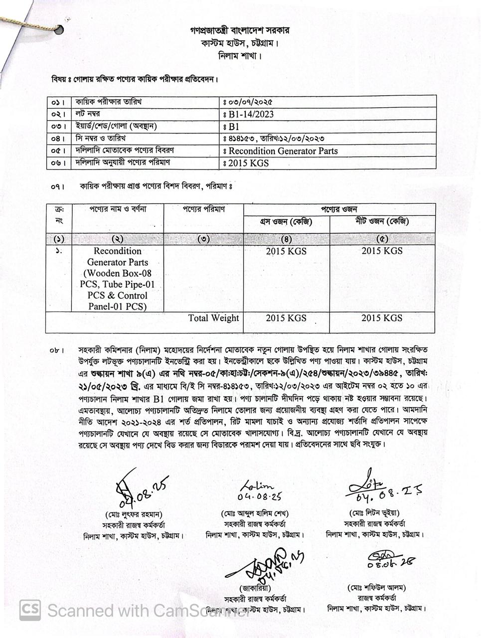 Terms & condition : আমদানি নীতি আদেশ এবং বিদ্যমান অন্যান্য আইন ও বিধি-বিধানের প্রযোজ্য সকল শর্ত পরিপালন এবং প্রযোজ্য ক্ষেত্রে রাসায়নিক পরীক্ষায় পণ্যের সঠিকতা ও ব্যবহার উপযোগিতা থাকা সাপেক্ষে খালাসকালে পণ্যের বর্ণনা এবং ওজন নিশ্চিত করে পণ্য ছাড়যোগ্য হবে। কোন লটভুক্ত পণ্যচালানে মেয়াদ উত্তীর্ণ/ধ্বসংযোগ্য পণ্য অন্তর্ভুক্ত থাকলে, উক্ত পণ্যচালানের ক্ষেত্রে মেয়াদ উত্তীর্ণ/ধ্বসংযোগ্য পণ্য ব্যতীত (প্রযোজ্য ক্ষেত্রে) কেবল মেয়াদযুক্ত/নিলামযোগ্য পণ্যসমূহ বিদ্যমান ও প্রযোজ্য আইন ও বিধি-বিধানের প্রযোজ্য সকল শর্ত পরিপালন সাপেক্ষে পণ্য ছাড়যোগ্য হবে। সার্ভার জটিলতা এড়ানোর জন্য আগ্রহী নিলাম ক্রেতাগণকে সরেজমিন পণ্য দেখে নিলামের নির্ধারিত তারিখ ও সময় শেষ হওয়ার পূর্বেই ই-নিলামে অংশগ্রহণ করার জন্য অনুরোধ করা যাচ্ছে। কোনরূপ কারণ দর্শানো ব্যতিরেকে কর্তৃপক্ষ যে কোন সময় ও পর্যায়ে যে কোন লট বা সকল লটের নিলাম আংশিক বা সম্পূর্ণ স্থগিত বা বাতিলের অধিকার সংরক্ষণ করেন।