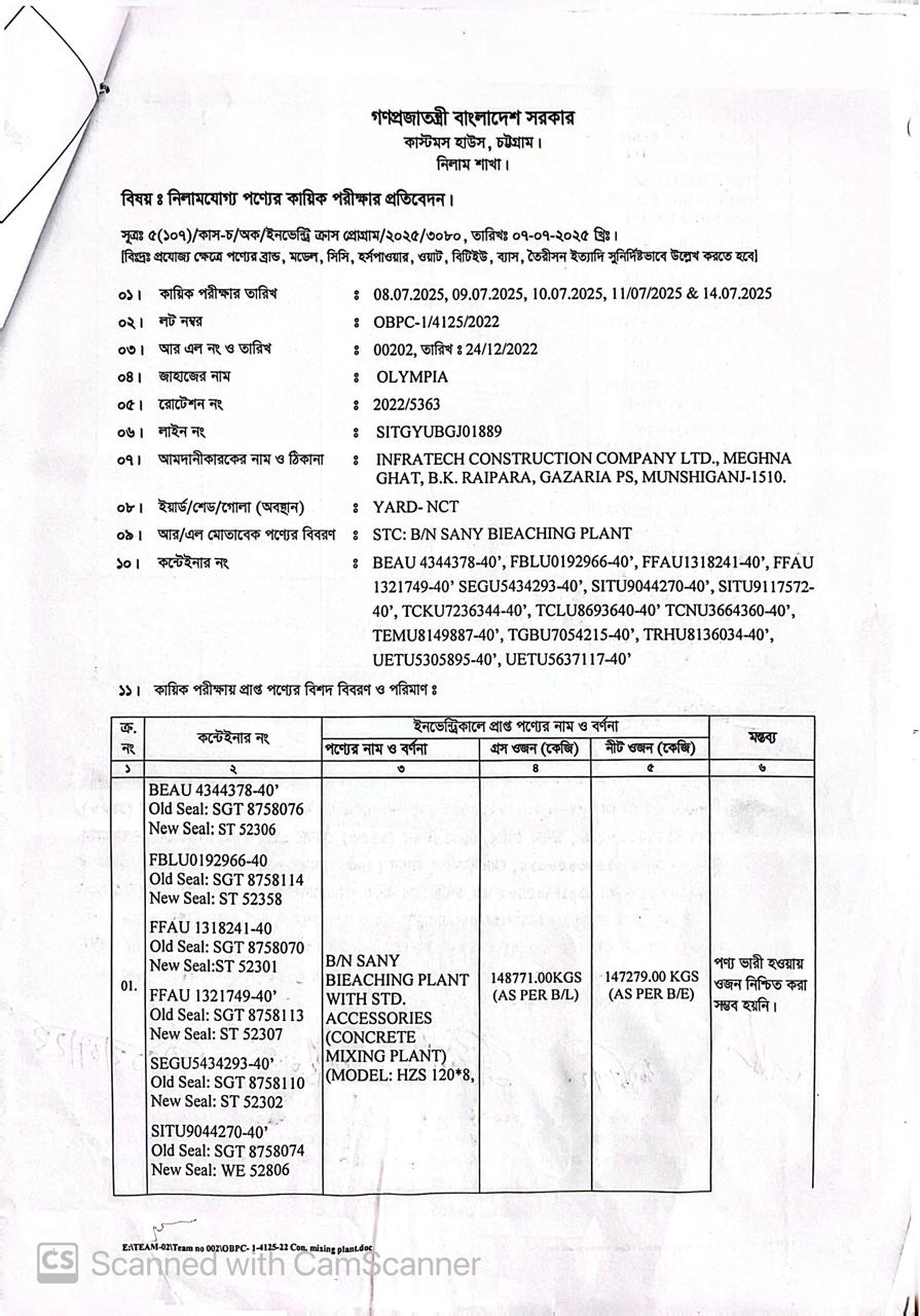 লটের শিরোনাম :B/N SANY Bleaching Plant With Std. Accessories (Concrete Mixing Plant) Model: HZS 120*8(Previous Bid: 0 TK)