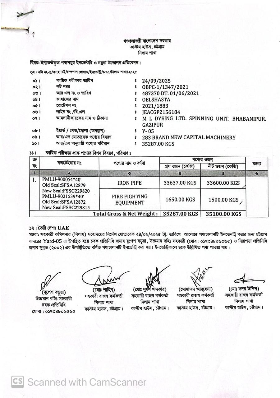 লটের শিরোনাম :1. Iron Pipe 33,600 Kgs 2. Fire Fighting Equipment 1500 Kgs(Previous Bid: 0 TK)