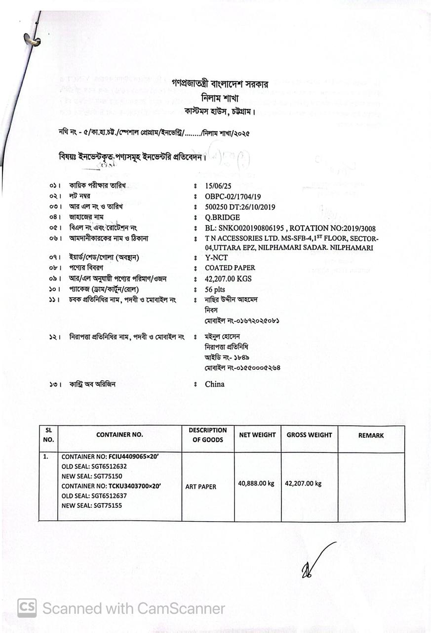 Terms & condition : আমদানি নীতি আদেশ এবং বিদ্যমান অন্যান্য আইন ও বিধি-বিধানের প্রযোজ্য সকল শর্ত পরিপালন এবং প্রযোজ্য ক্ষেত্রে রাসায়নিক পরীক্ষায় পণ্যের সঠিকতা ও ব্যবহার উপযোগিতা থাকা সাপেক্ষে খালাসকালে পণ্যের বর্ণনা এবং ওজন নিশ্চিত করে পণ্য ছাড়যোগ্য হবে। কোন লটভুক্ত পণ্যচালানে মেয়াদ উত্তীর্ণ/ধ্বসংযোগ্য পণ্য অন্তর্ভুক্ত থাকলে, উক্ত পণ্যচালানের ক্ষেত্রে মেয়াদ উত্তীর্ণ/ধ্বসংযোগ্য পণ্য ব্যতীত (প্রযোজ্য ক্ষেত্রে) কেবল মেয়াদযুক্ত/নিলামযোগ্য পণ্যসমূহ বিদ্যমান ও প্রযোজ্য আইন ও বিধি-বিধানের প্রযোজ্য সকল শর্ত পরিপালন সাপেক্ষে পণ্য ছাড়যোগ্য হবে। সার্ভার জটিলতা এড়ানোর জন্য আগ্রহী নিলাম ক্রেতাগণকে সরেজমিন পণ্য দেখে নিলামের নির্ধারিত তারিখ ও সময় শেষ হওয়ার পূর্বেই ই-নিলামে অংশগ্রহণ করার জন্য অনুরোধ করা যাচ্ছে। কোনরূপ কারণ দর্শানো ব্যতিরেকে কর্তৃপক্ষ যে কোন সময় ও পর্যায়ে যে কোন লট বা সকল লটের নিলাম আংশিক বা সম্পূর্ণ স্থগিত বা বাতিলের অধিকার সংরক্ষণ করেন।