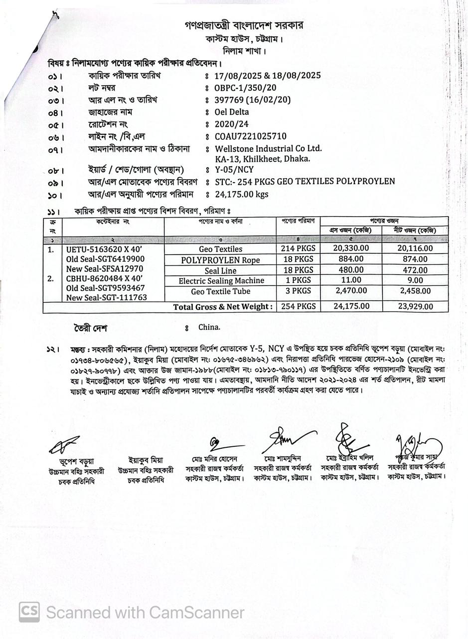 Terms & condition : আমদানি নীতি আদেশ এবং বিদ্যমান অন্যান্য আইন ও বিধি-বিধানের প্রযোজ্য সকল শর্ত পরিপালন এবং প্রযোজ্য ক্ষেত্রে রাসায়নিক পরীক্ষায় পণ্যের সঠিকতা ও ব্যবহার উপযোগিতা থাকা সাপেক্ষে খালাসকালে পণ্যের বর্ণনা এবং ওজন নিশ্চিত করে পণ্য ছাড়যোগ্য হবে। কোন লটভুক্ত পণ্যচালানে মেয়াদ উত্তীর্ণ/ধ্বসংযোগ্য পণ্য অন্তর্ভুক্ত থাকলে, উক্ত পণ্যচালানের ক্ষেত্রে মেয়াদ উত্তীর্ণ/ধ্বসংযোগ্য পণ্য ব্যতীত (প্রযোজ্য ক্ষেত্রে) কেবল মেয়াদযুক্ত/নিলামযোগ্য পণ্যসমূহ বিদ্যমান ও প্রযোজ্য আইন ও বিধি-বিধানের প্রযোজ্য সকল শর্ত পরিপালন সাপেক্ষে পণ্য ছাড়যোগ্য হবে। সার্ভার জটিলতা এড়ানোর জন্য আগ্রহী নিলাম ক্রেতাগণকে সরেজমিন পণ্য দেখে নিলামের নির্ধারিত তারিখ ও সময় শেষ হওয়ার পূর্বেই ই-নিলামে অংশগ্রহণ করার জন্য অনুরোধ করা যাচ্ছে। কোনরূপ কারণ দর্শানো ব্যতিরেকে কর্তৃপক্ষ যে কোন সময় ও পর্যায়ে যে কোন লট বা সকল লটের নিলাম আংশিক বা সম্পূর্ণ স্থগিত বা বাতিলের অধিকার সংরক্ষণ করেন।